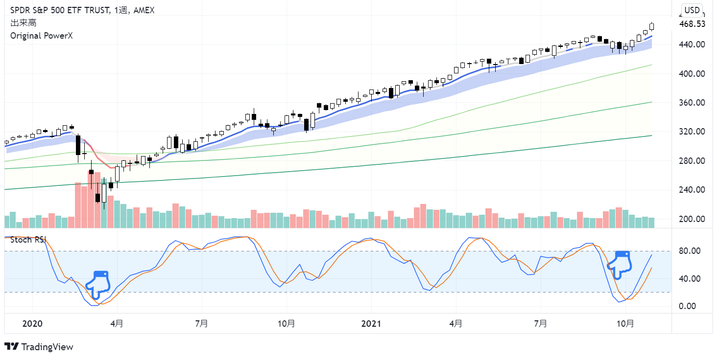 いろいろと考えた結果、S&P500指数の週足のチャートで、ストキャスティクスRSIが20を下回ったら一括投資する、というのがよいのではないかと思いました。S&P500の代表的なETF $SPY のチャートを添付します。