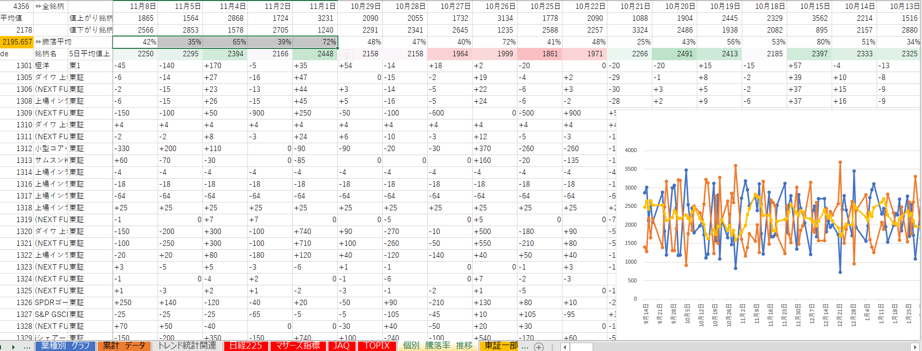 ※月間50%の法則とは、東証全体の日別値上がり銘柄比率の合計が月単位で50%付近になることです。