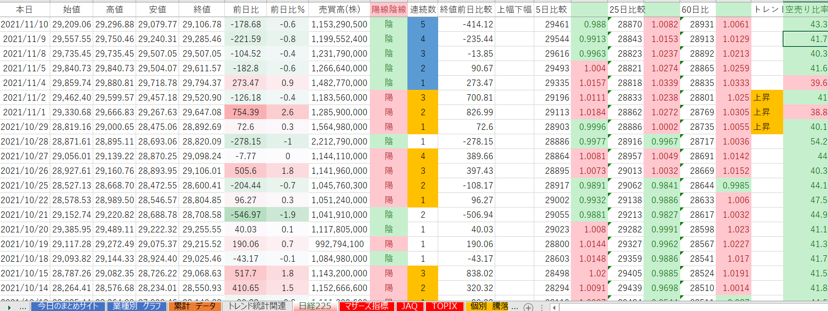 5日連続陰線を付けその間に-414円です。結構下がりました。