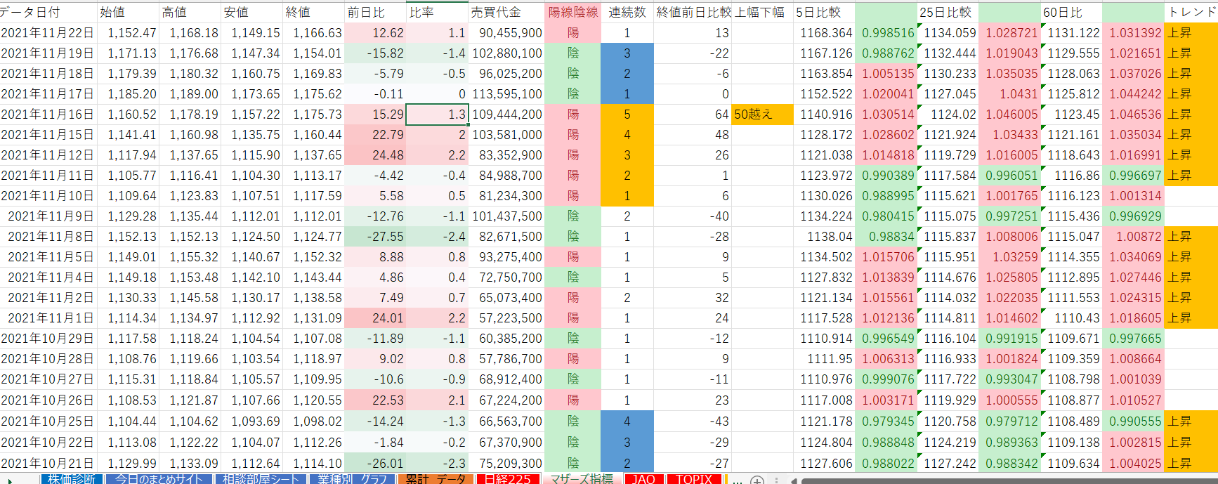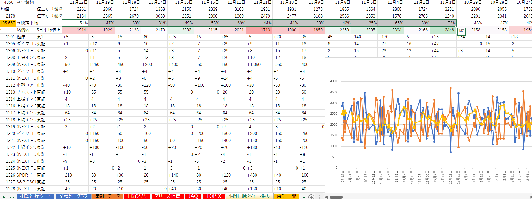 ※月間50%の法則とは、東証全体の日別値上がり銘柄比率の合計が月単位で50%付近になることです。