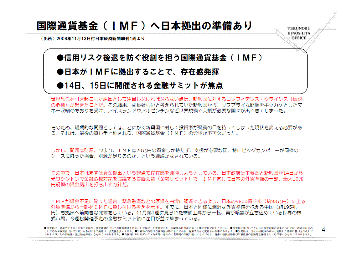 首脳会議(金融サミット)で、IMF向けに日本の外貨準備の一部、