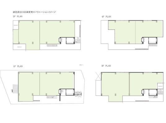 建築が長期的な需要に、柔軟に対応しながら継続していくためにも、社会情勢による用途転用がしやすい状態をつくり、地域や次世代に寄与していくことを目指しています。区画変更をしやすくするため、1フロア2区画のシンプルなフレームとし、界壁は非構造壁とすることで隣接区画の一体利用も想定しています。
