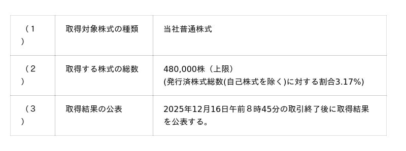 当社は、2025年12月15日開催の取締役会において、会社法第165条第2項の規定に基づく自己株式の取得に係る事項について決議しましたが、その具体的な取得方法について下記のとおり決議しましたので、お知らせいたします。