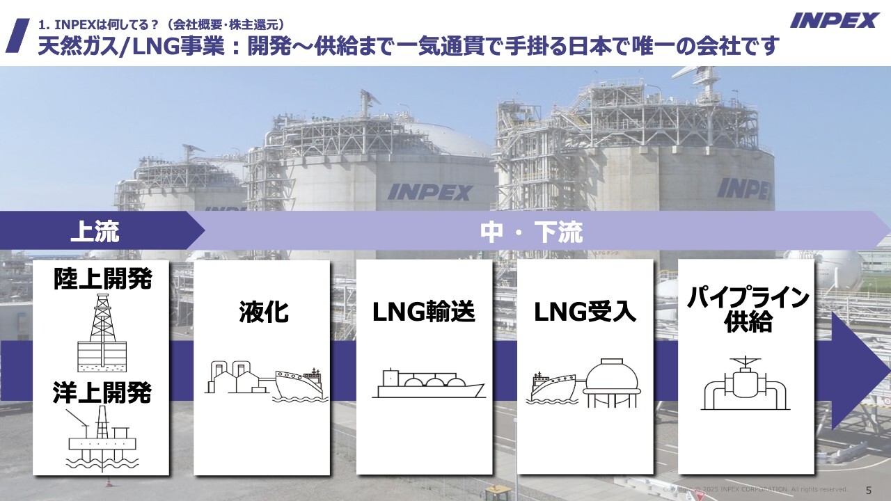 当社は、陸上の開発、海上の開発、液化プラントの運営、タンカーによるLNGの輸送、日本国内でのLNG受け入れ基地の運営、および自前のパイプラインを通じたお客さまへの供給を、一気通貫でオペレーションできる日本で唯一の会社です。