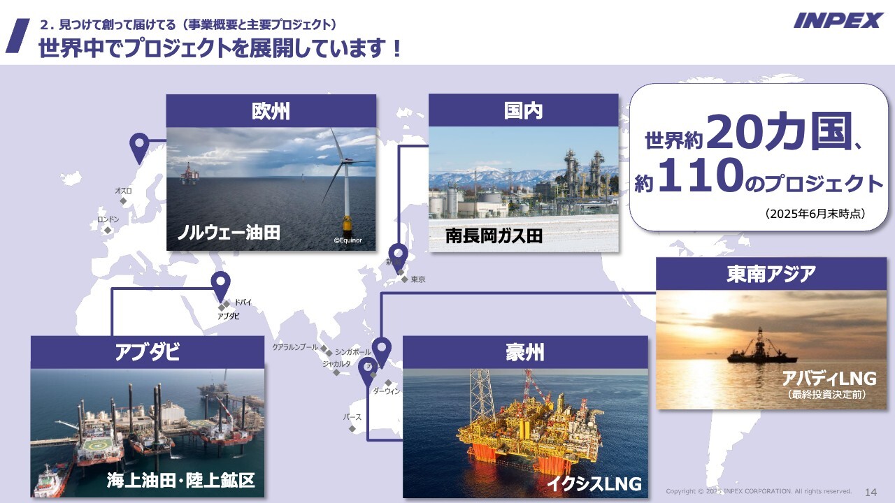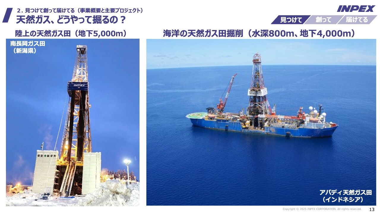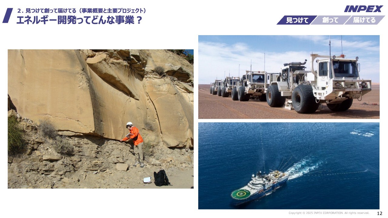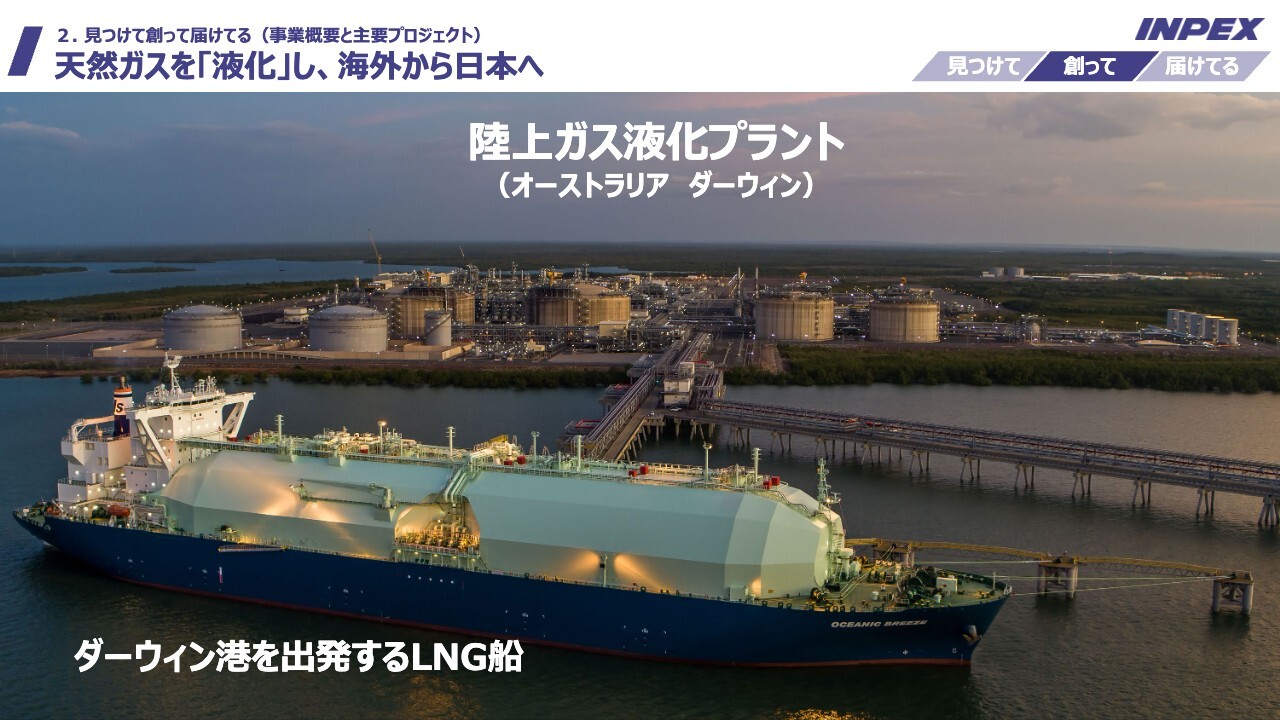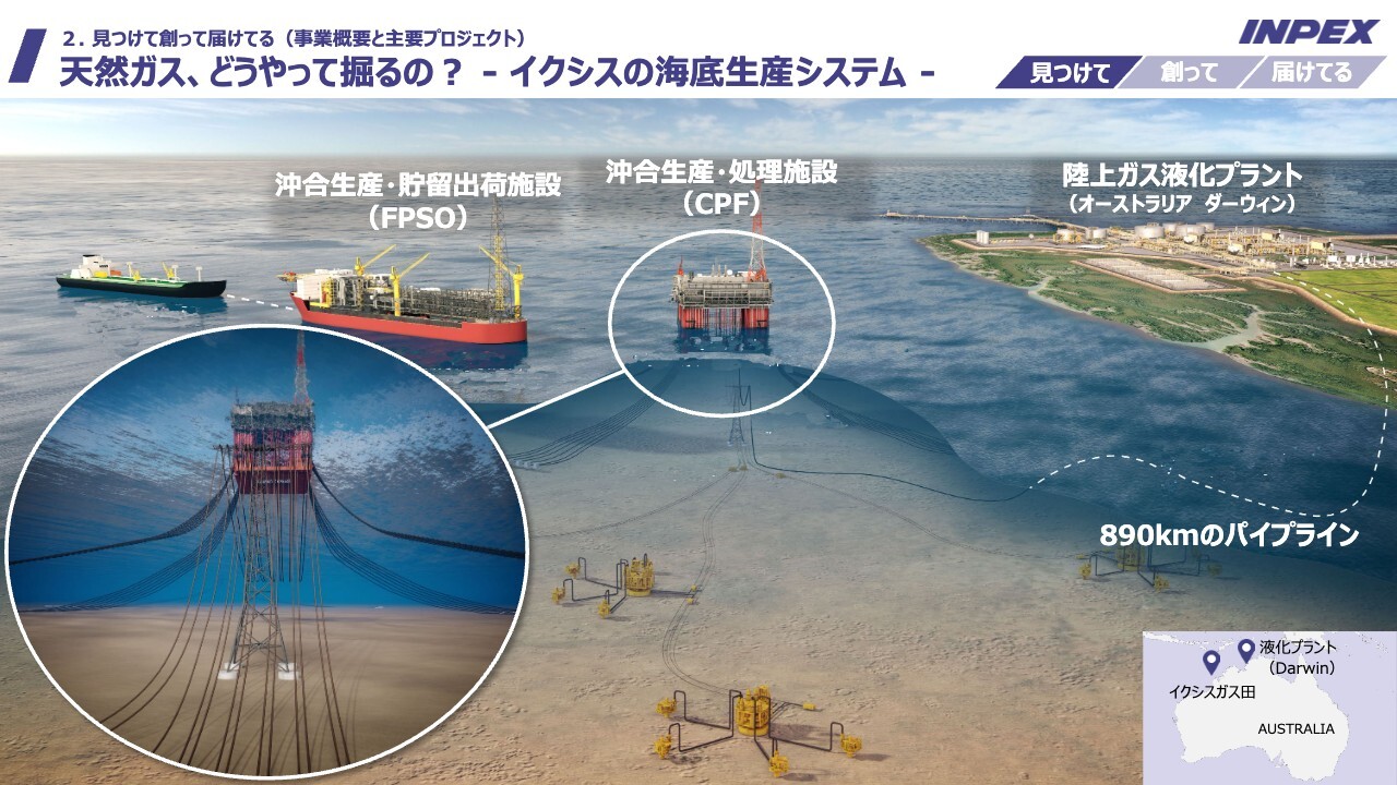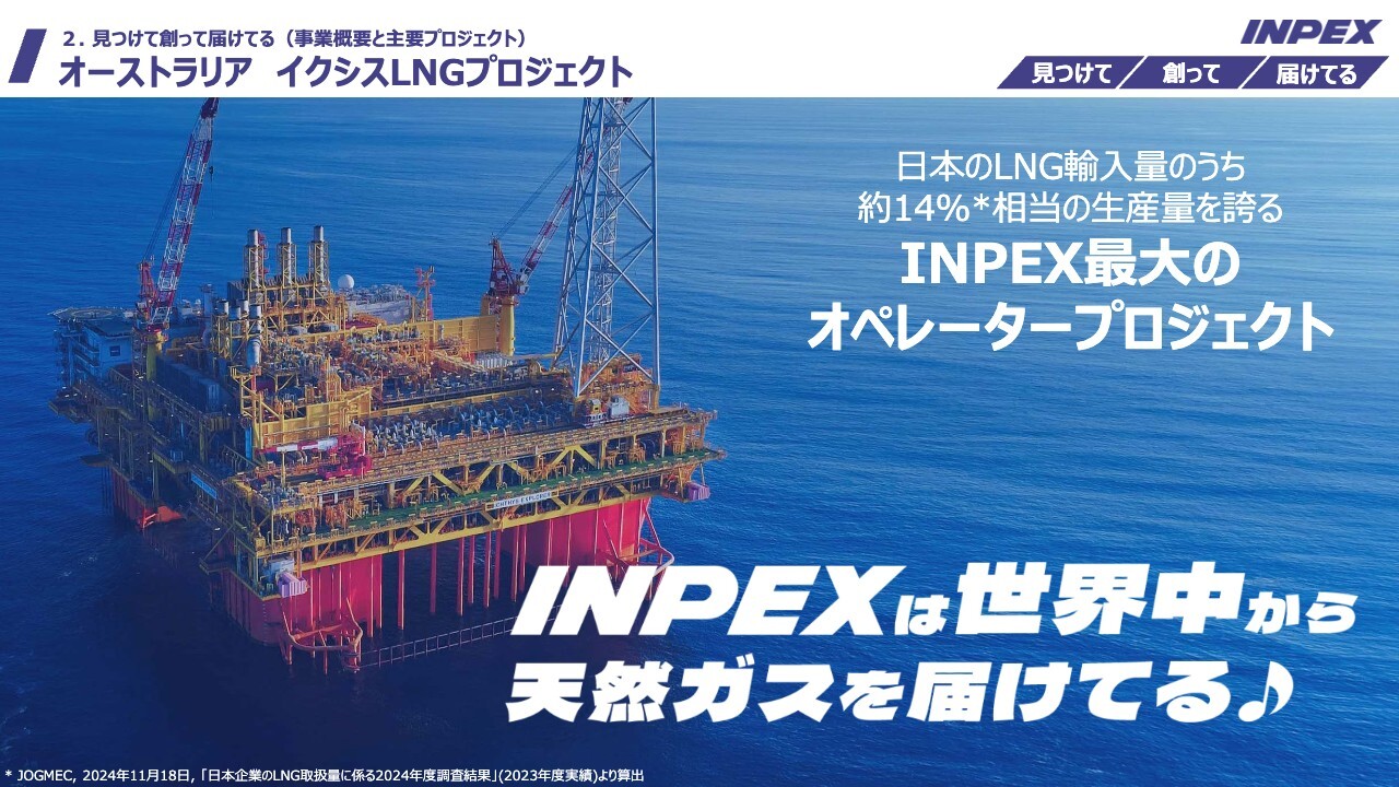 MC/司会者:続いて「見つけて創って届けてる」と題し、INPEXの事業概要と主要プロジェクトについてご説明いただきます。