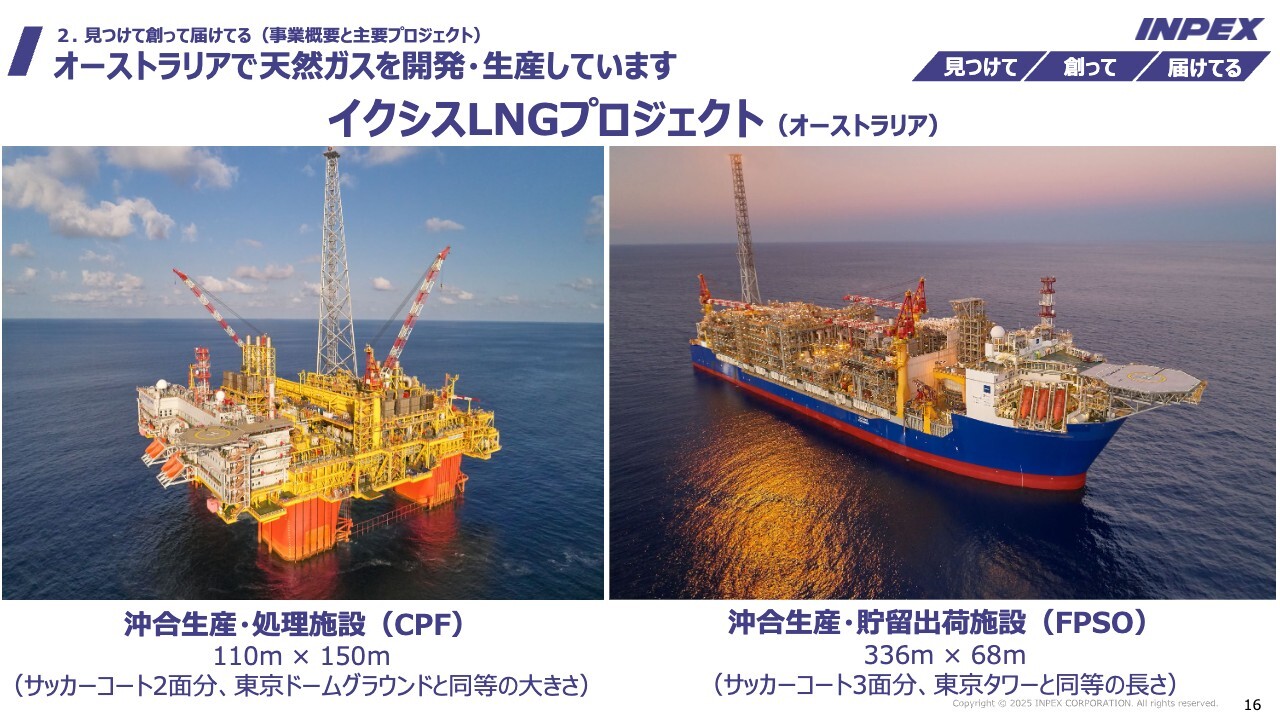 スライドの写真は、後ほどご紹介するオーストラリア北西部の大陸棚で、当社が主要プロジェクトとして運営している「イクシスLNGプロジェクト」で使用する洋上の生産施設です。