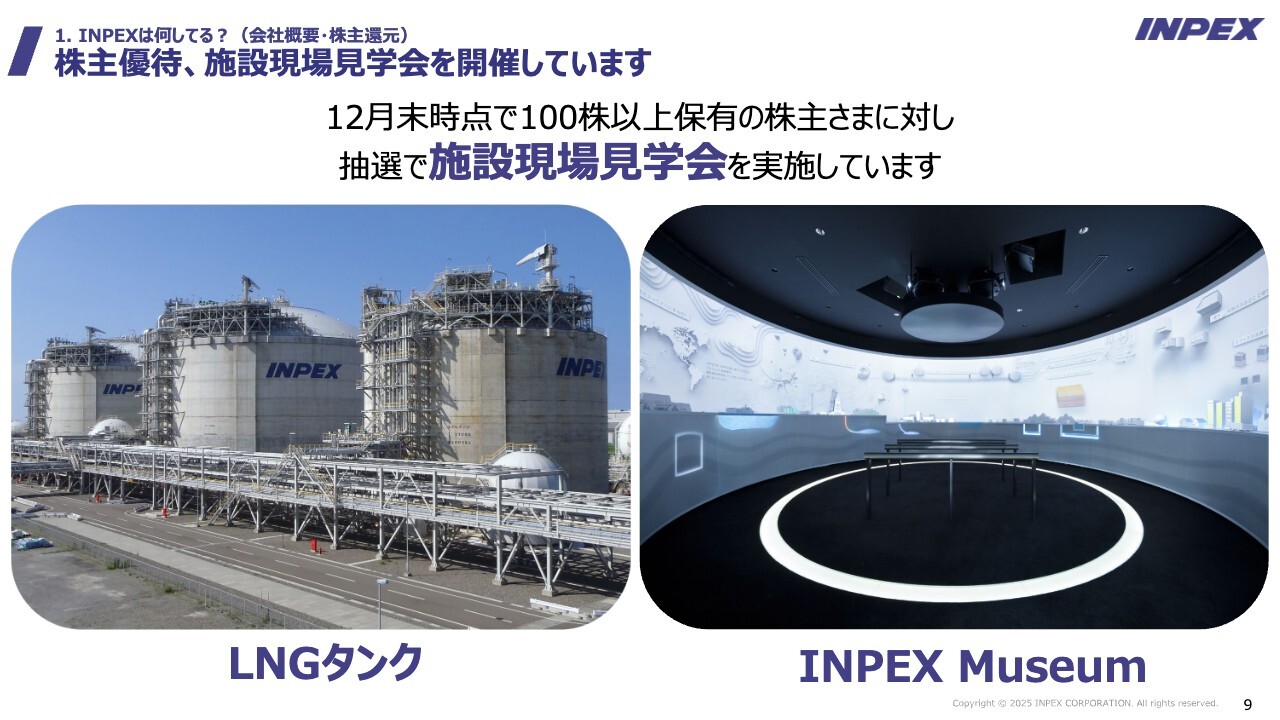 滝本:12月末時点で100株以上保有していただいている株主さまを対象に、抽選で現場見学会を実施しています。非常に人気があり、競争率が高くて申し訳ないのですが、今年秋の開催から募集人数を倍増したため、当選確率が上がっています。スライド左側の巨大なLNGタンクもご覧いただけます。