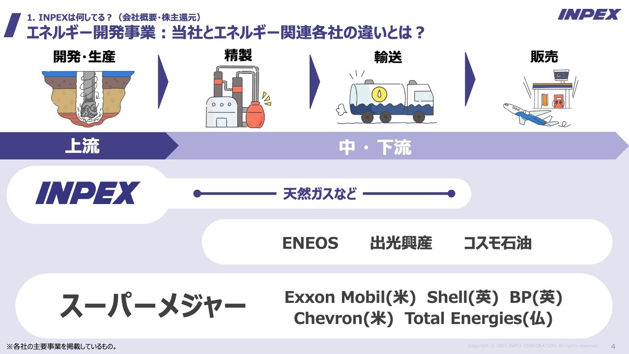 世界には、Exxon MobilやShellなど、当社の約5倍から8倍の規模を持つスーパーメジャーと呼ばれるエネルギー開発企業が存在します。Shellは日本にもガソリンスタンドがありましたが、これらの企業は上流から中・下流まで、つまり開発・生産、精製、輸送、販売までを一貫して行っています。