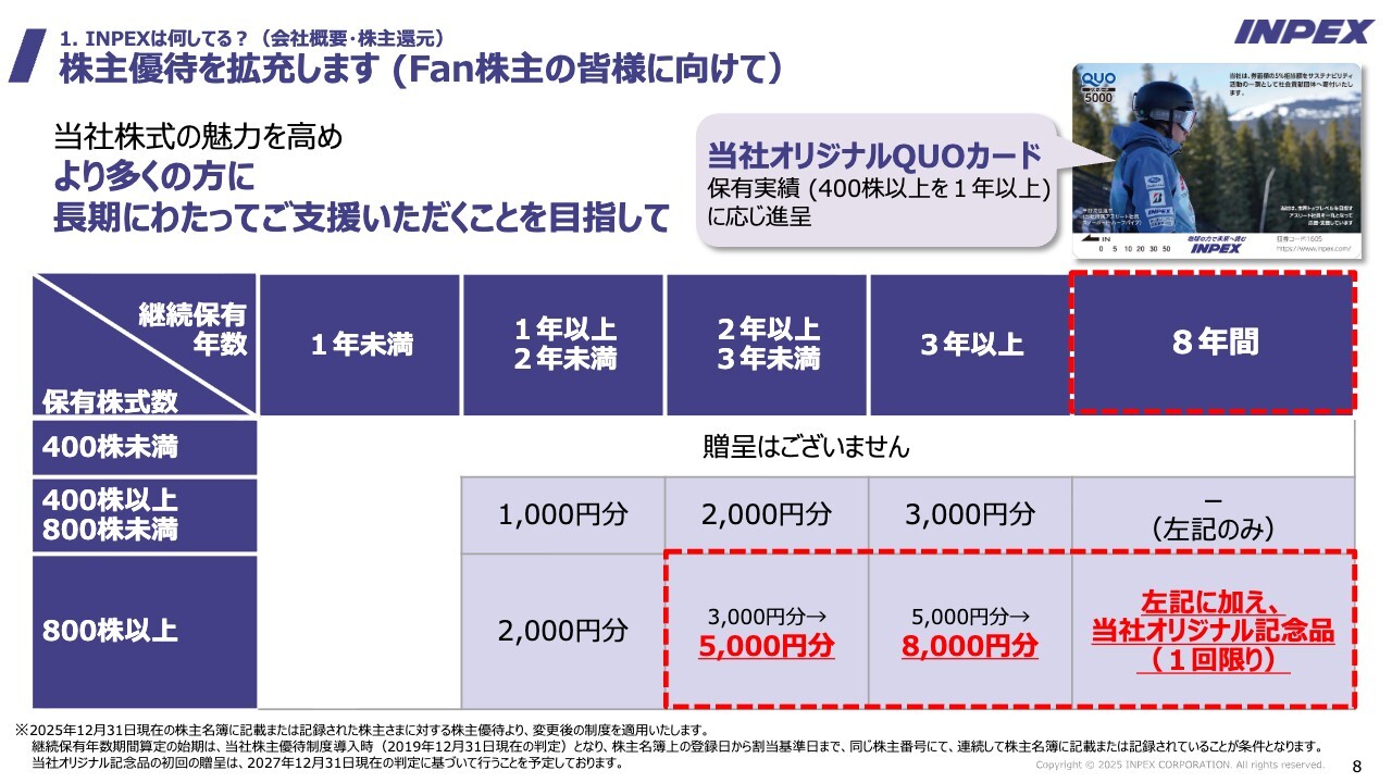 2025年12月末以降は、2年以上かつ800株以上保有している株主さまには5,000円分、3年以上かつ800株以上を保有している株主さまには8,000円分に変更するという拡充を考えています。さらに、800株以上を8年間保有していただいた株主の方には、1回限りではありますが、当社オリジナルの記念品をお贈りする予定です。ぜひご期待ください。