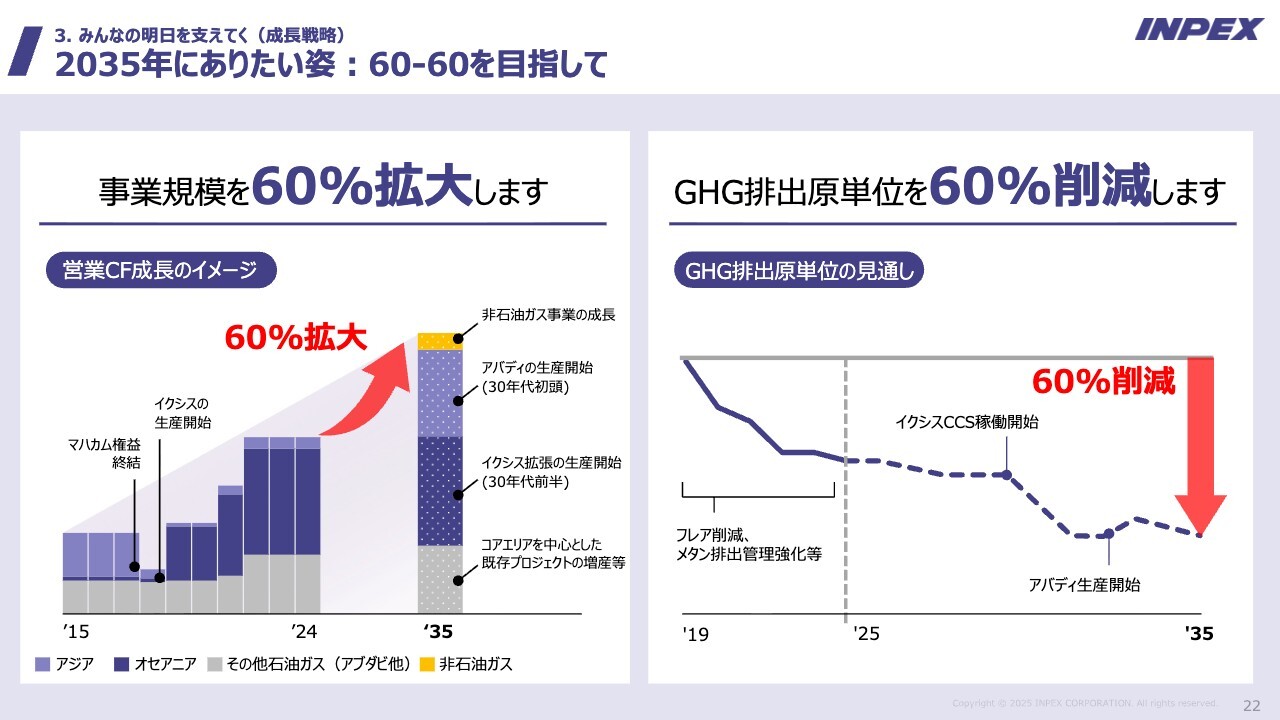 滝本:今年2月に、新たな中期経営計画と新たなビジョン「INPEX Vision 2035」を発表しました。これらの特にご説明したい部分を1枚にまとめたスライドです。