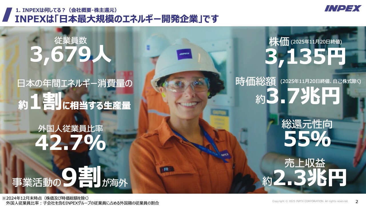 2部以降で詳しくご説明しますが、まず当社がどのような会社であるか、株主還元としてどのような取り組みを行っているかをご説明します。INPEXが何をしている会社かご存じでしょうか?