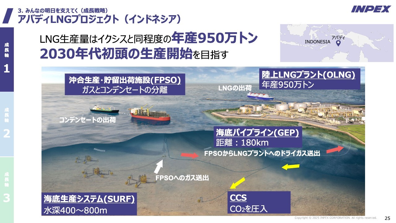滝本:次のコアプロジェクトとして、インドネシアで「アバディLNGプロジェクト」を計画しています。年間生産量は950万トンと、先ほどご紹介したイクシスLNGプロジェクトと同規模のLNG事業を展開する予定です。