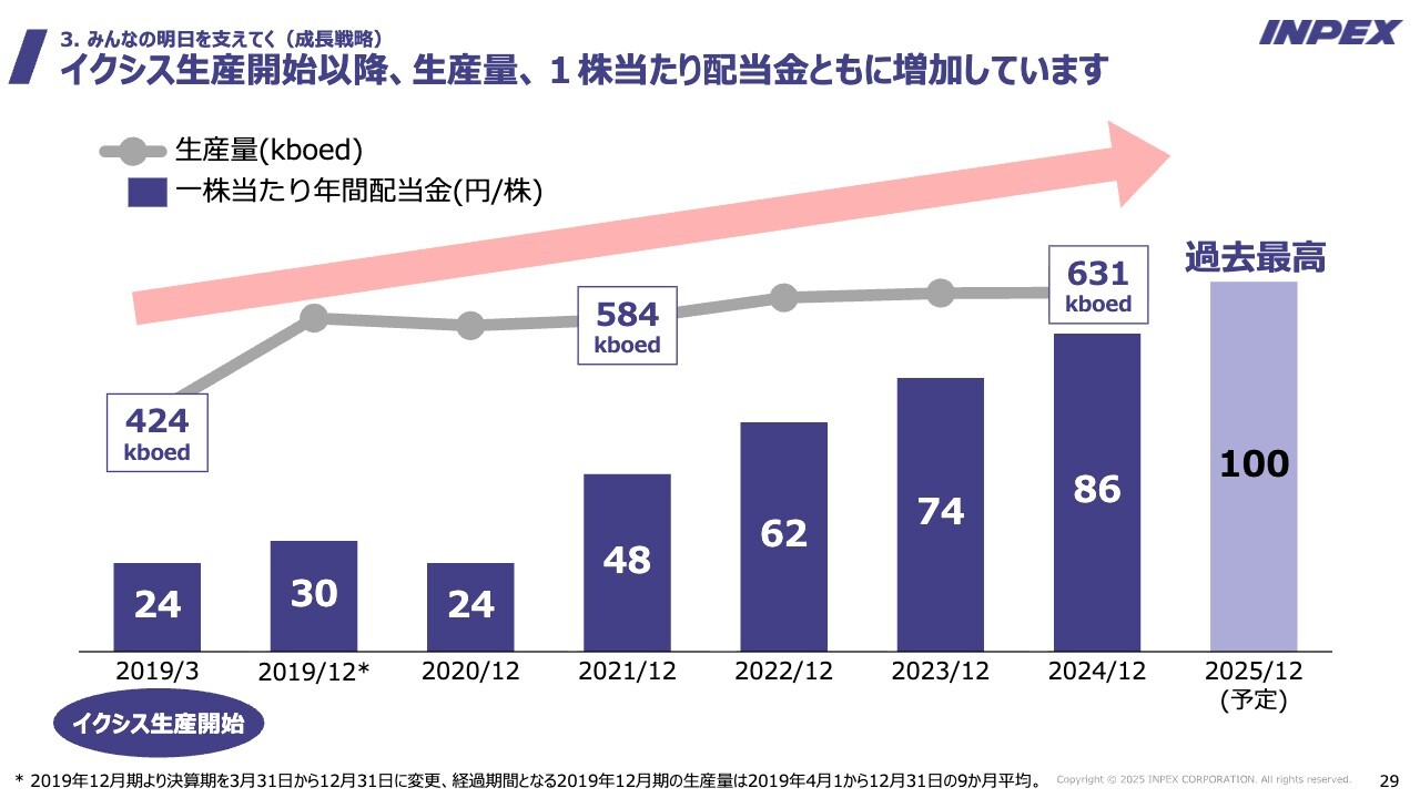 イクシス生産開始以降、生産量、1株当たり配当金ともに増加しています