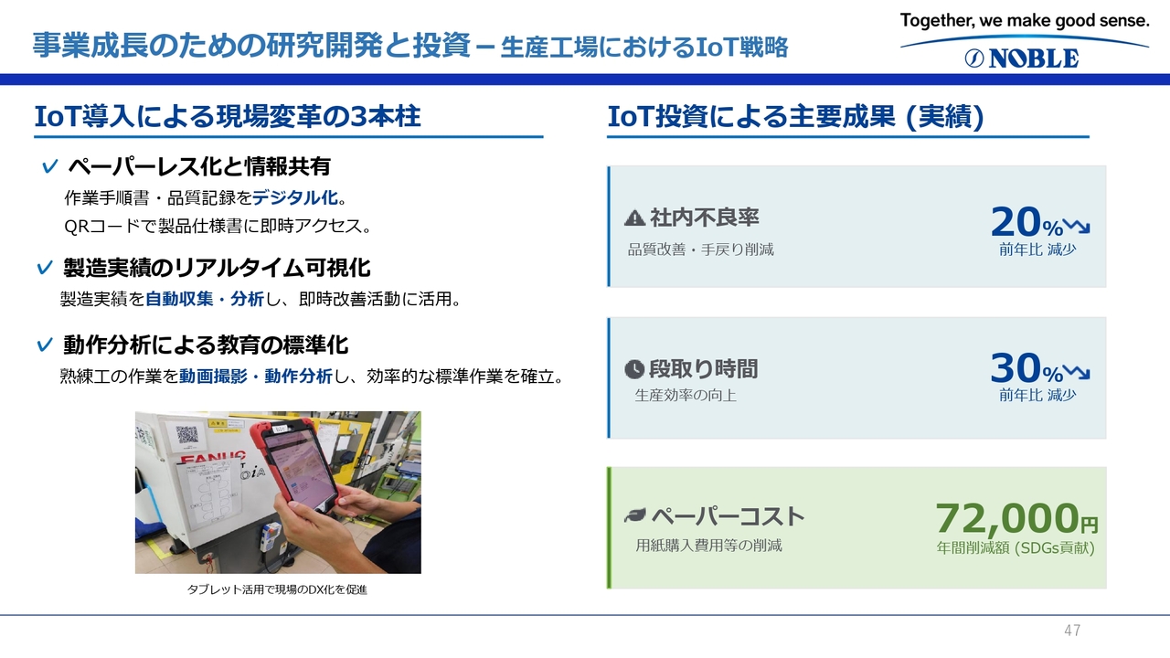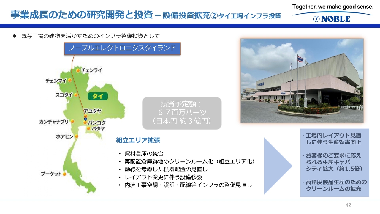 直近で決定したインフラ投資の一例です。スライドは、弊社のタイ製造子会社であるノーブルエレクトロニクスタイランドの製造インフラを見直し、それに関する資料をまとめたものです。