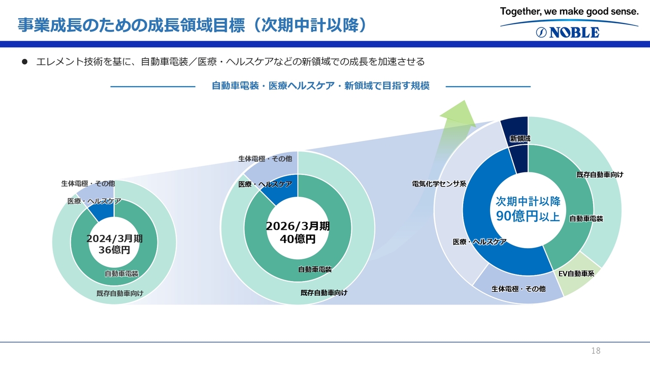 弊社は、自動車電装や医療・ヘルスケアなどの新領域で成長を加速させ、スライドのグラフで示す売上目標を目指しています。