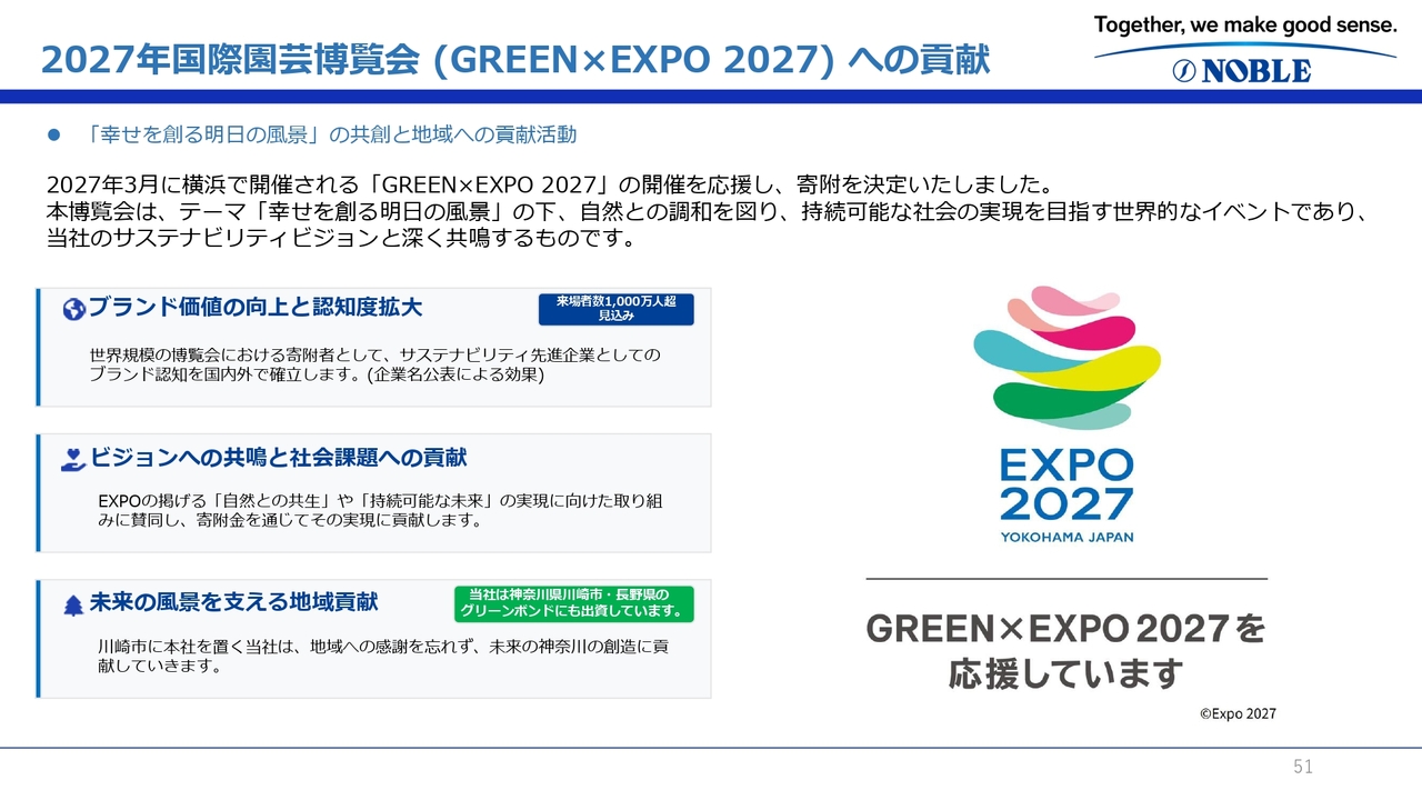 ESG関連については、弊社は2027年3月に横浜で開催される「GREEN×EXPO 2027」への協賛を決定しました。本博覧会は、テーマ「幸せを創る明日の風景」のもと、自然との調和を図り、持続可能な社会の実現を目指す世界的なイベントです。