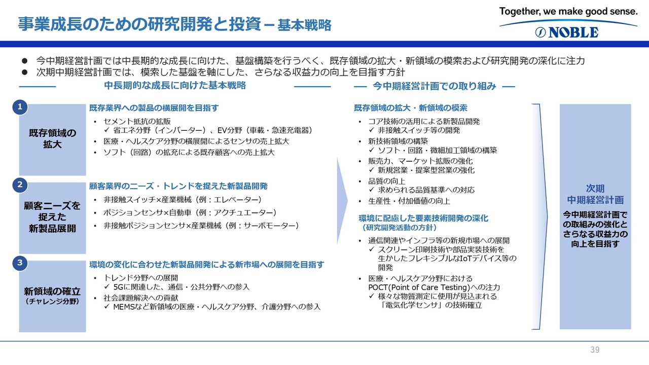 1つ目は収益力の向上です。成長戦略として、弊社のエレメント技術をさらに深め、向上させることで、さまざまな市場への拡販と新規事業分野への進出にチャレンジし、事業規模を拡大して売上の増加および利益率の改善を図っていきます。