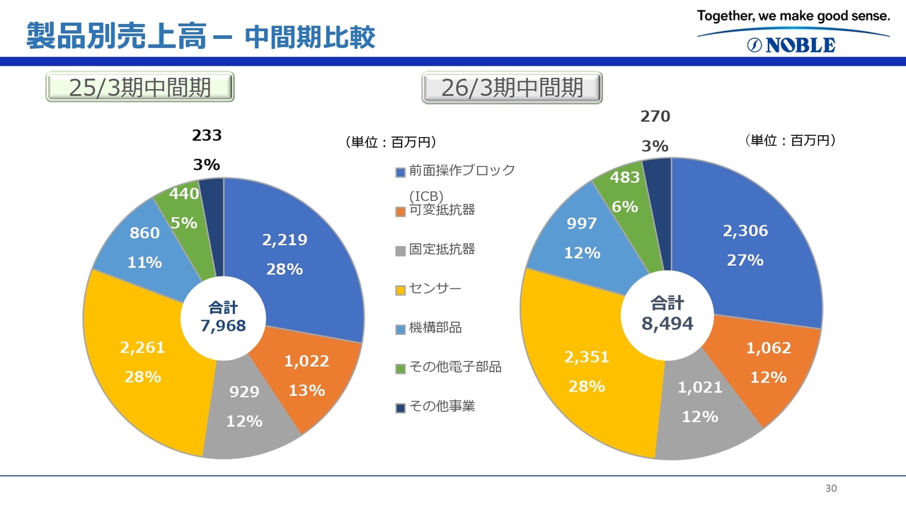 製品別の売上高について、2025年3月期と2026年3月期の中間期実績を円グラフで比較したスライドです。前年同期と比較すると、全製品で売上高が増加しています。