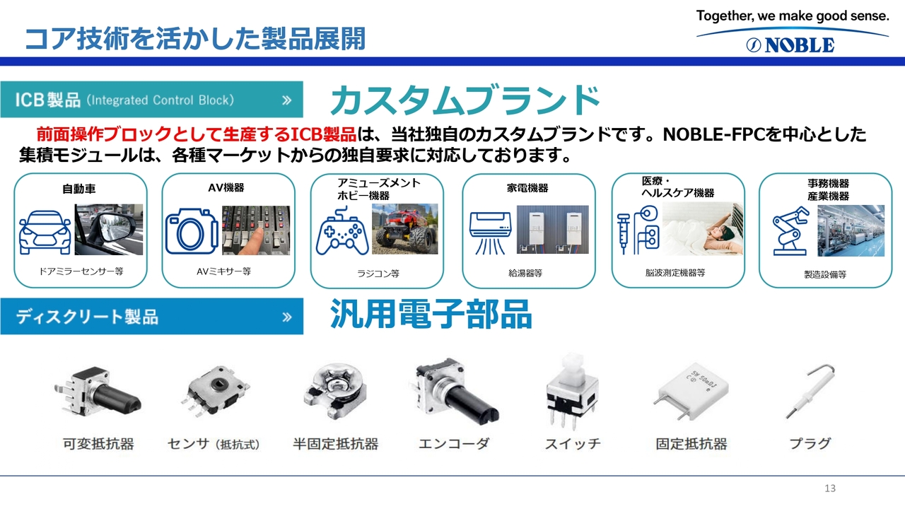 次に、エレメント技術などのコア技術を活用した製品展開についてご説明します。1つ目は、前面操作ブロックと呼ばれるICB製品です。これは、お客さまからのご要望一つひとつに対応するカスタムブランドの製品です。