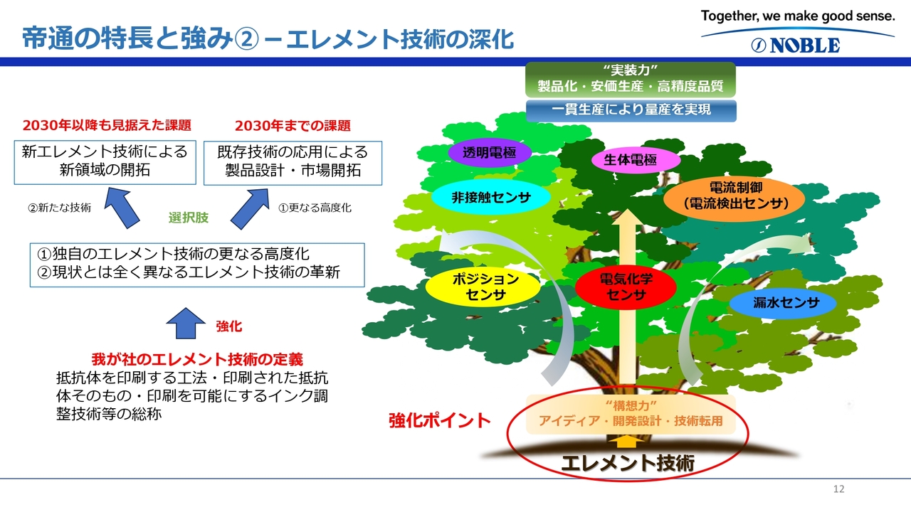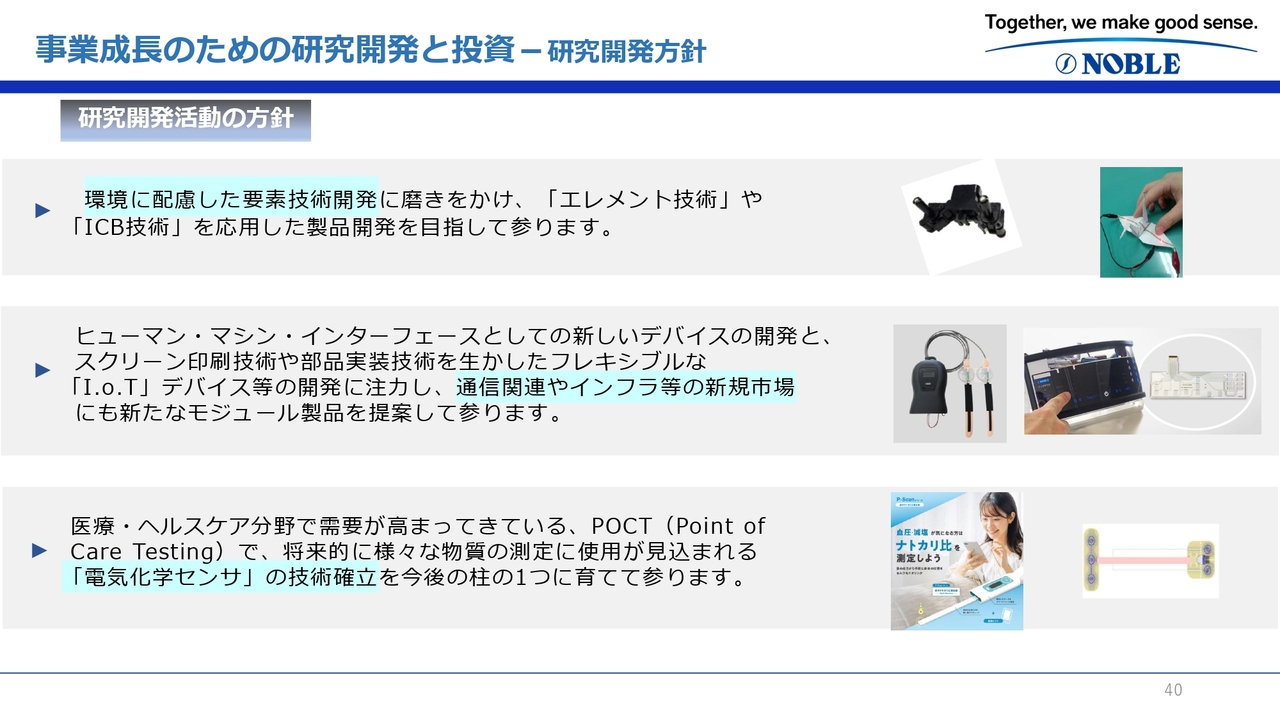 2つ目は、ヒューマン・マシン・インターフェイスとしての新しいデバイスの開発と、スクリーン印刷技術や部品実装技術を活かしたフレキシブルなIoTデバイス等の開発に注力することです。通信関連やインフラ等の新規市場に向けて新たなモジュール製品を提案していきます。