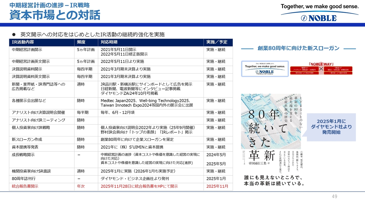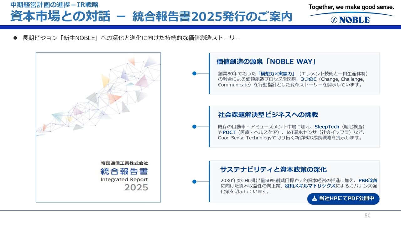 3つ目として、マルチプル向上に関しては、IR戦略としてさらなる認知度向上を目指し、積極的な情報開示を通じた資本市場との対話を拡充するとともに、サステナビリティへの取り組みも継続していきます。