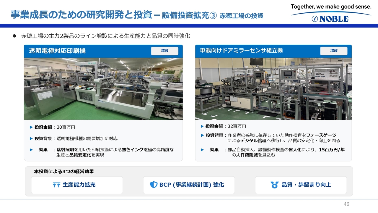 スライドは、赤穂工場における設備投資の一例を示しています。当工場では先端技術を牽引するための設備投資を進めており、特に最近は需要が増加している透明電極やドアミラーセンサ向けの設備投資を実施しています。