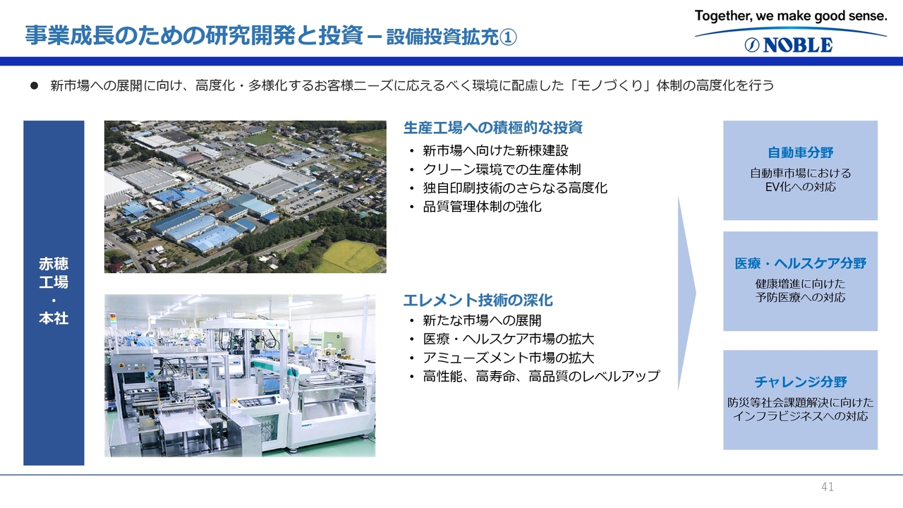 特に製造インフラについては、より高精度な製品を製造し、安定した品質管理体制の強化、クリーン環境での生産体制を図るため、生産工場へのインフラ投資を積極的に進めていきます。
