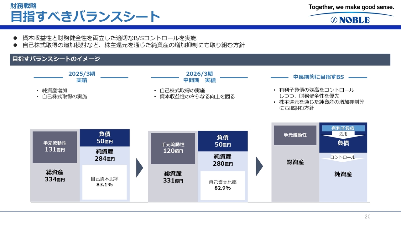 そのために、有利子負債の残高を適切に管理し、財務健全性を優先するとともに、株主還元を通じた純資産の増加抑制などにも取り組む予定です。