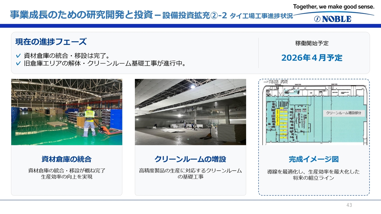 こちらのスライドは、ノーブルエレクトロニクスタイランドの製造インフラ見直しの進捗状況と完成イメージ図を示しています。本格稼働は2026年4月を予定しています。