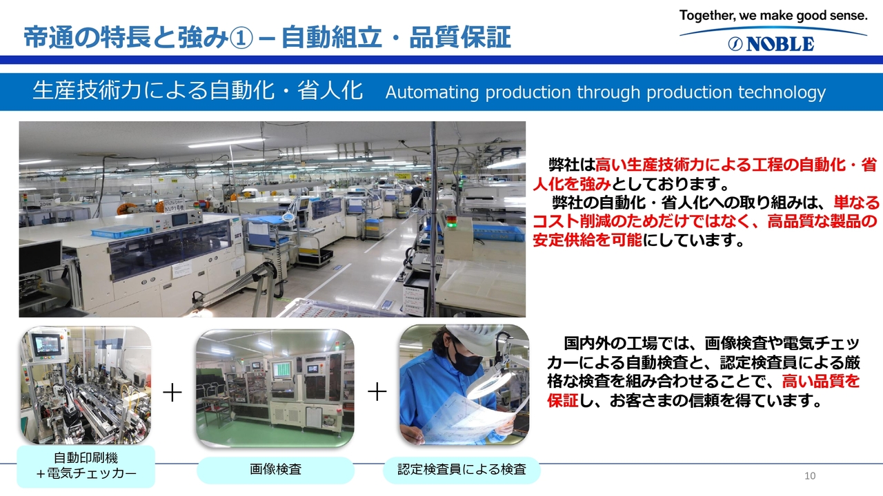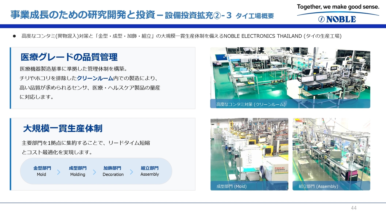 ノーブルエレクトロニクスタイランドの概要をまとめたスライドです。弊社の海外工場の中でも、多くの機能を持ち一貫生産体制を整える工場となっています。この工場の機能を拡充することで、グループ全体の売上増加を牽引していきたいと考えています。