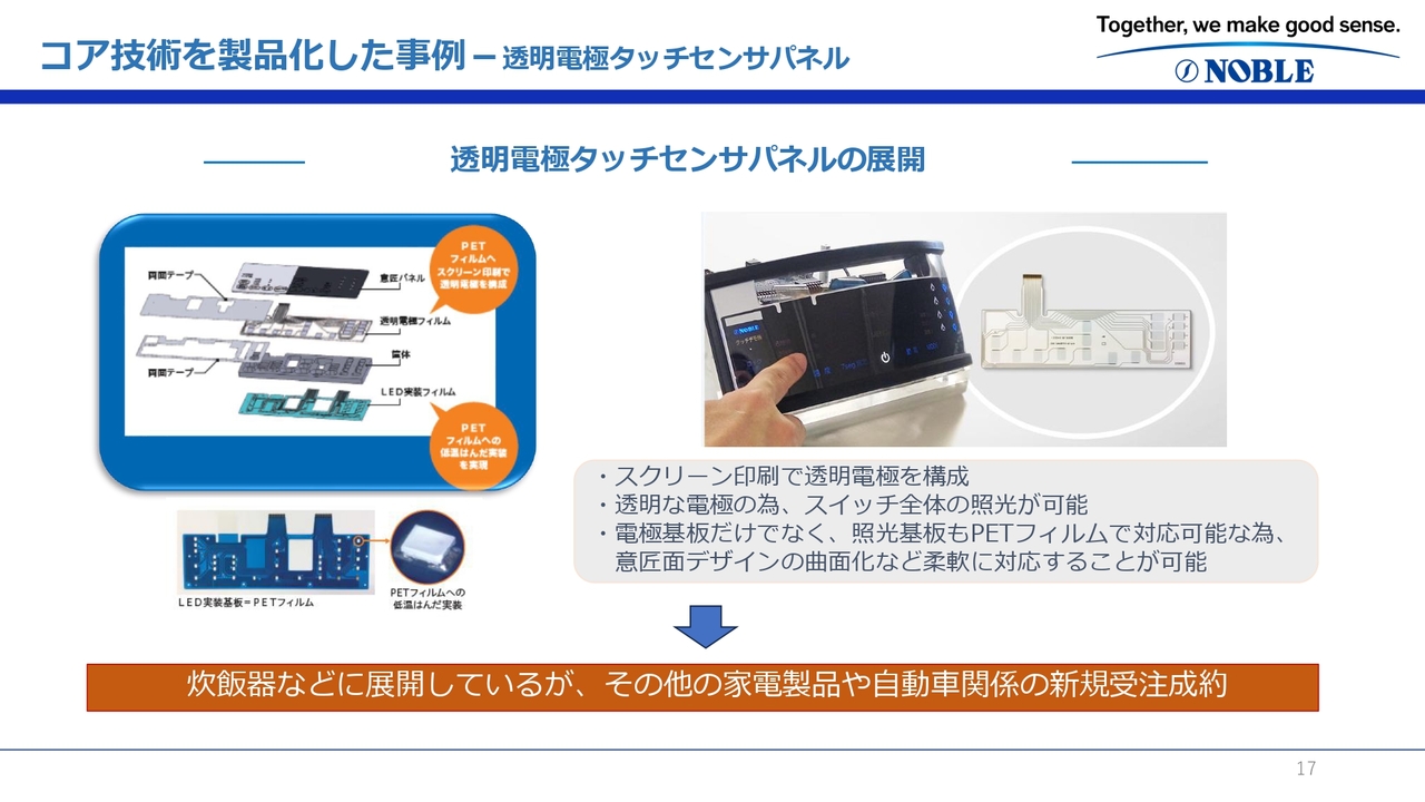 透明電極タッチセンサパネルは、すでに炊飯器に採用されている技術です。この透明電極を他の家電製品や自動車関連製品にも提案しています。