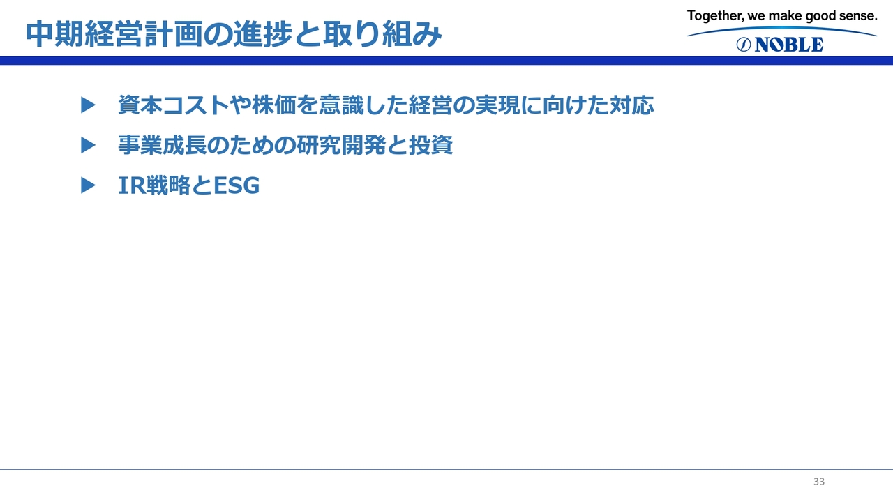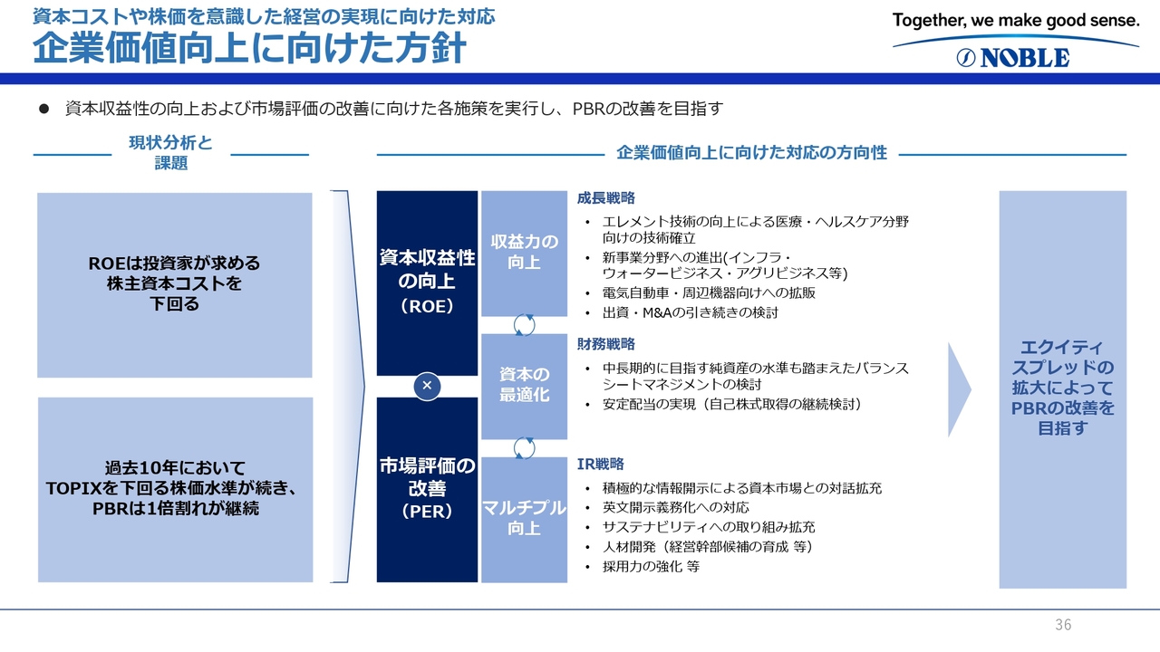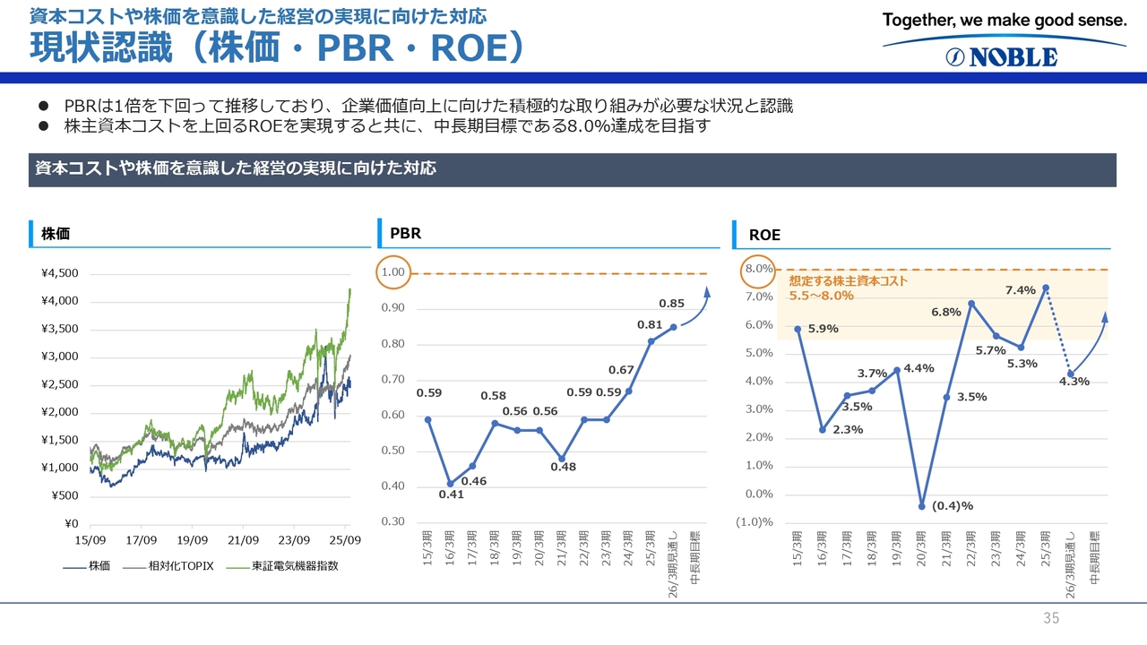 現状認識で述べたとおり、株価は徐々に上昇しているものの、ROEは目標値を下回っている状況です。このため、資本収益性の向上および市場評価の改善に向けて、各施策を実行していきます。
