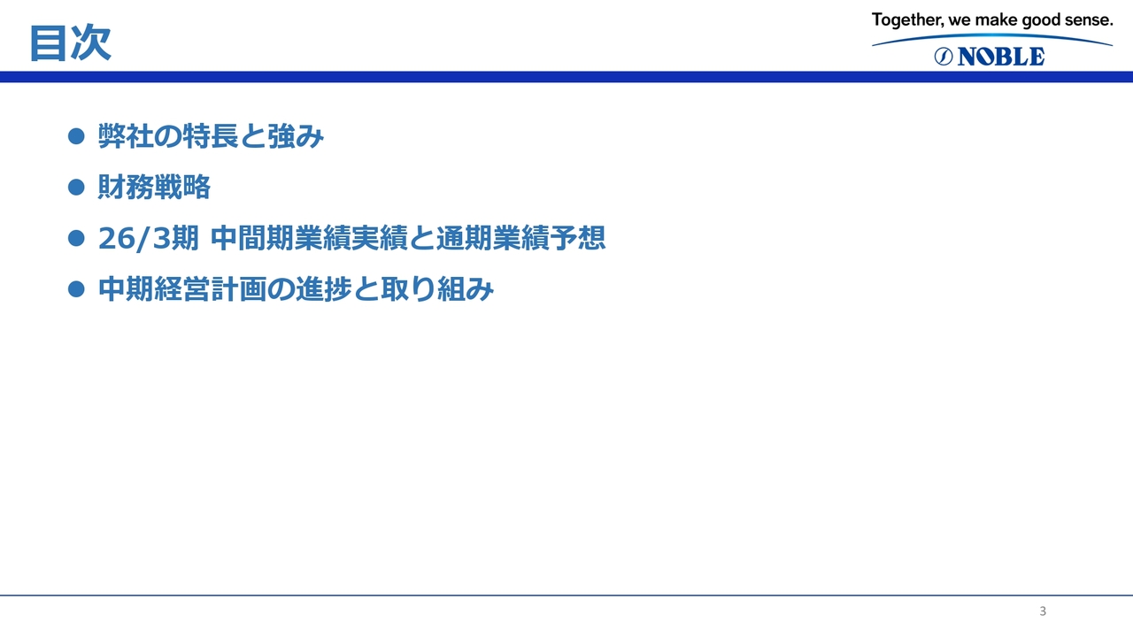 本日の目次です。弊社の特徴と強みについてご説明した後、財務戦略、2026年3月期中間期の業績実績と通期業績予想についてご説明します。次に、中期経営計画の進捗と取り組みについて、最後に弊社が取り組むさまざまな事例についてもご紹介します。