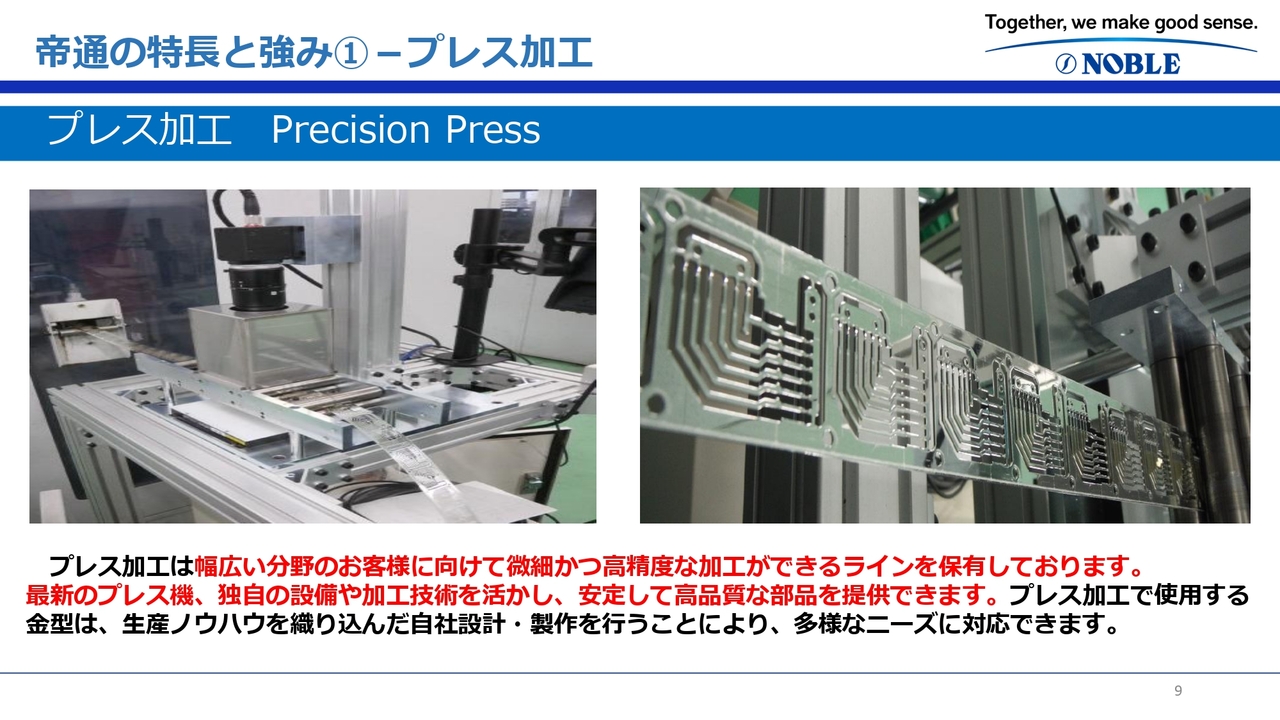 プレス加工部門についてです。内製の金型をプレス機に取り付け、金属材料の打ち抜きや曲げ加工を高速で行うことで、微細で精度の高い部品の製作が可能です。