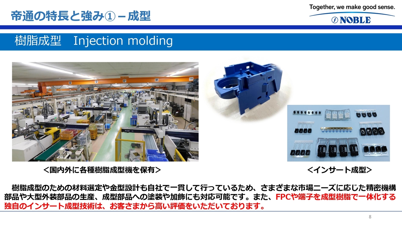 樹脂成型部門についてです。金型を成型機に取り付け、樹脂材料を金型に流し込むことで、さまざまな市場ニーズに応じた精密機構部品や外装部品の生産が可能です。