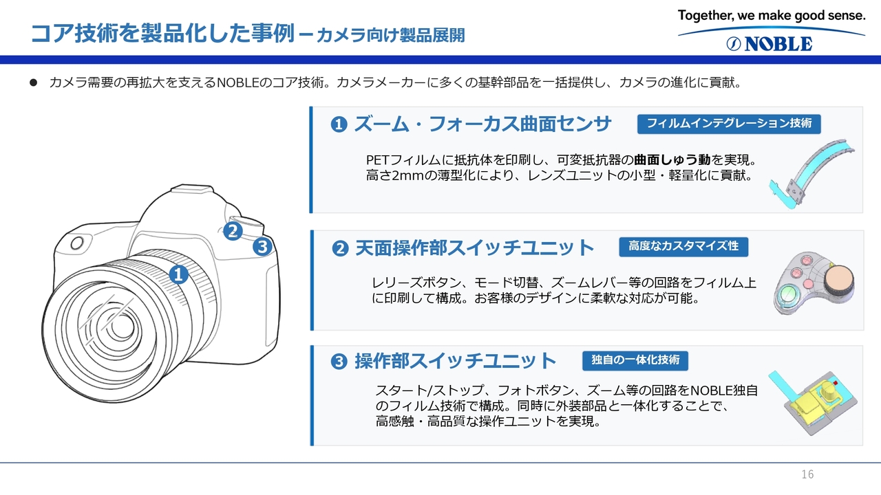 スライドは、デジタルカメラ関連で弊社のコア技術が採用されている製品事例です。デジタルカメラ市場は、スマートフォンの普及により市場規模がピーク時と比較して縮小しましたが、高画質・高性能のミラーレス一眼が見直され、近年では需要が復活してきています。
