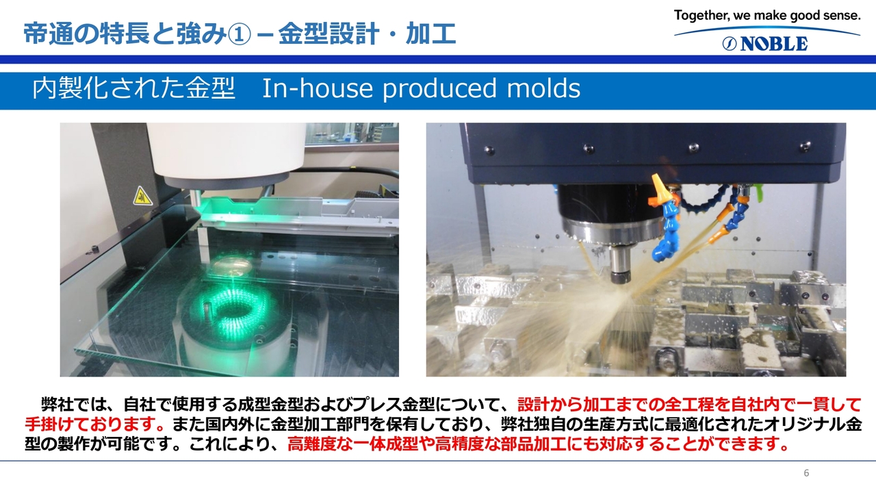 ここからは、弊社の強みである各部門や工程についてご紹介します。まず、金型設計および製造部門についてです。弊社では、成型金型やプレス金型を設計から加工まで一貫して自社内で手掛け、国内外に金型加工部門を保有しています。