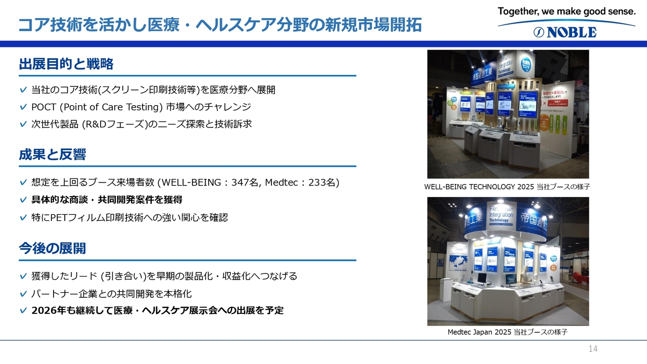弊社が注力する医療・ヘルスケア分野への市場開拓の一例です。この分野は新規参入に近いため、各種展示会への継続的な出展を通じ、同市場での認知度を高め、弊社の技術を知っていただくことで売上拡大を目指しています。