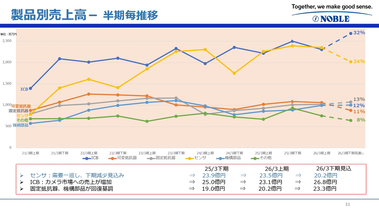 カスタム製品であるICBについては、AV機器向けや自動車関係で下期に大幅な増加が見込まれ、売上高は26億8,000万円を予想しています。