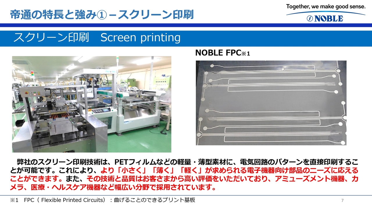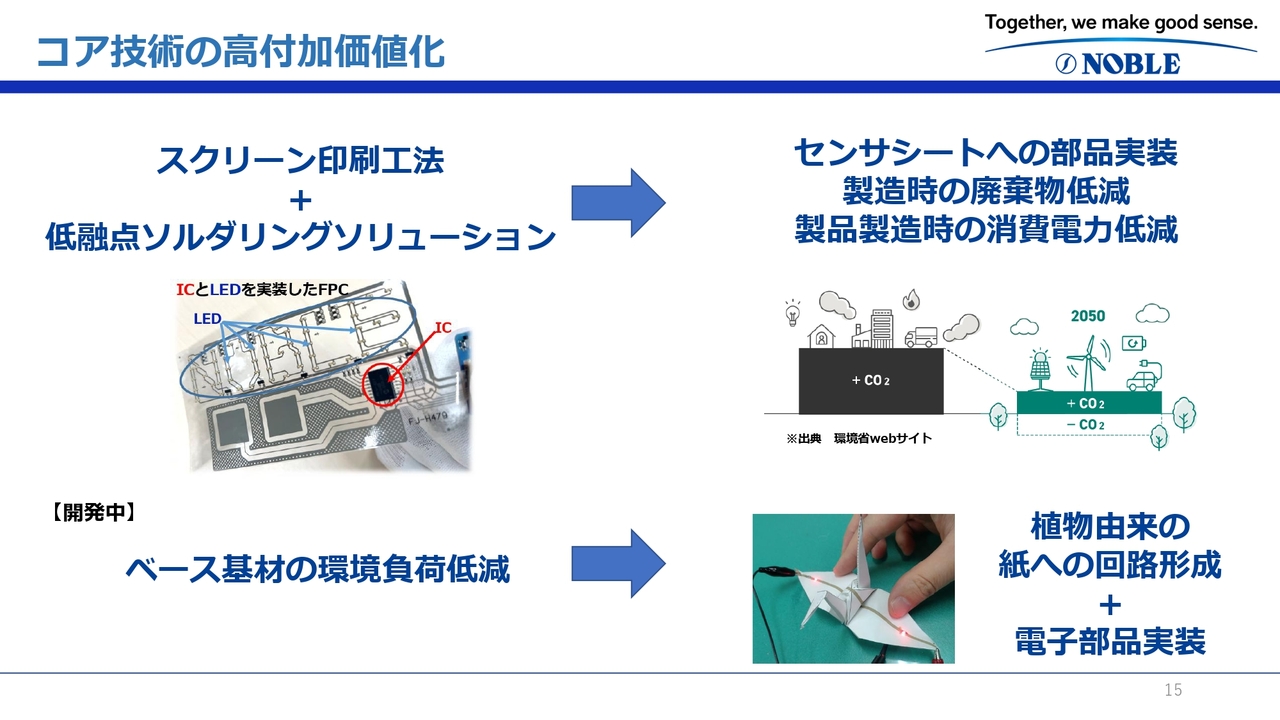 コア技術に関しても高付加価値化を進めています。スライド上段の製品事例は、スクリーン印刷と低融点でのはんだ部品実装を行うことで、製造時の廃棄物低減と消費電力の低減を実現し、CO2排出量削減にも寄与しています。
