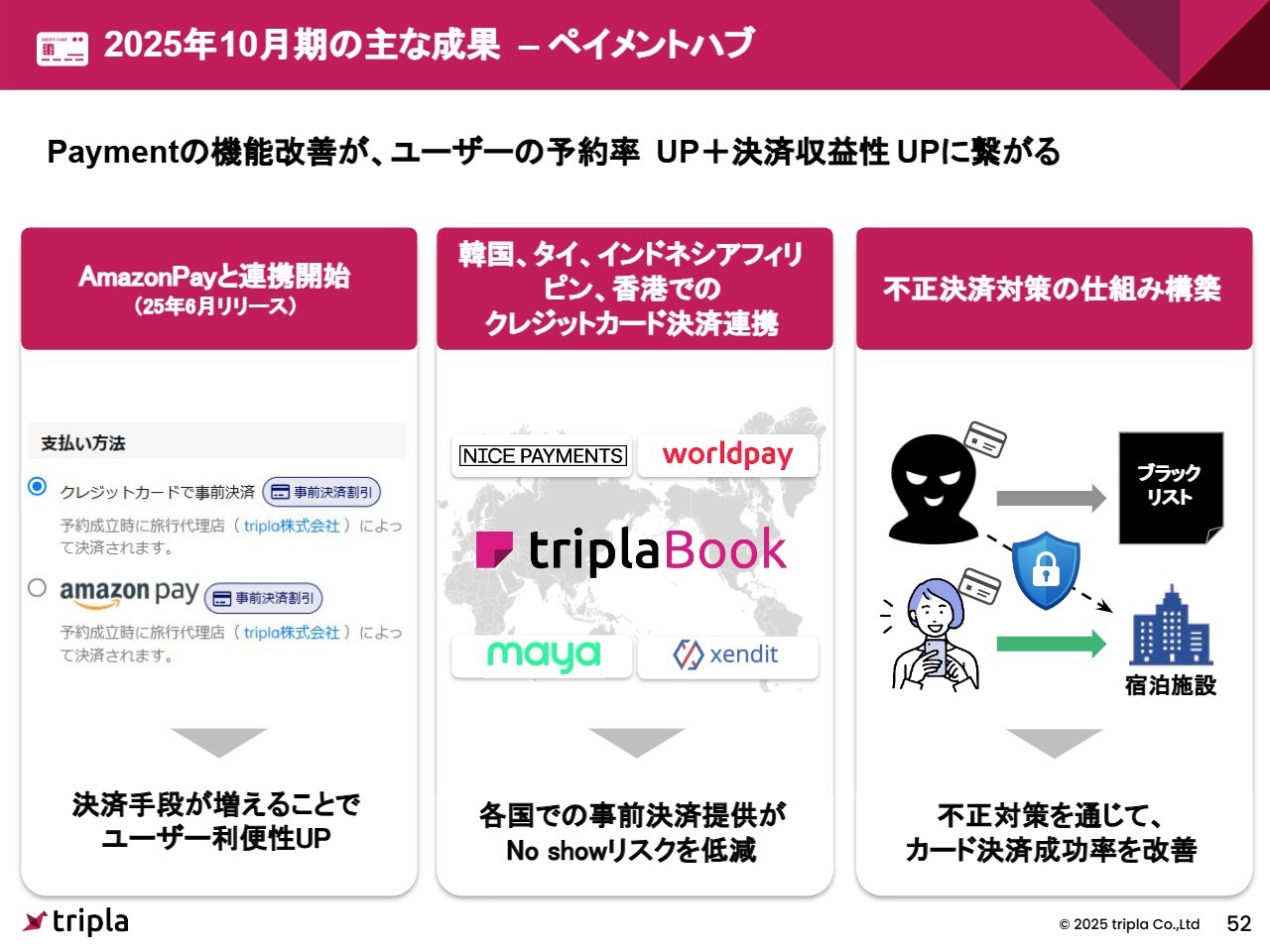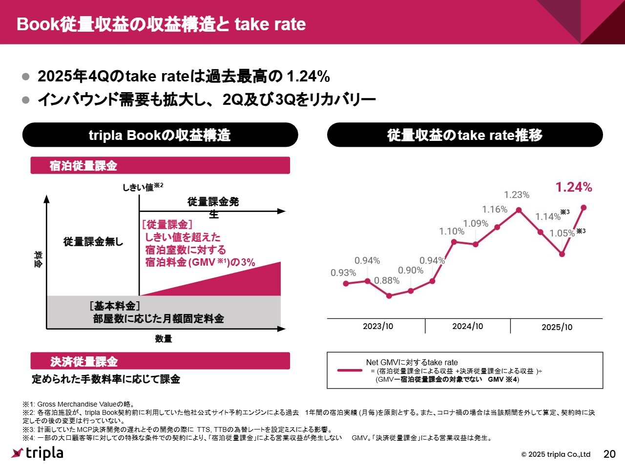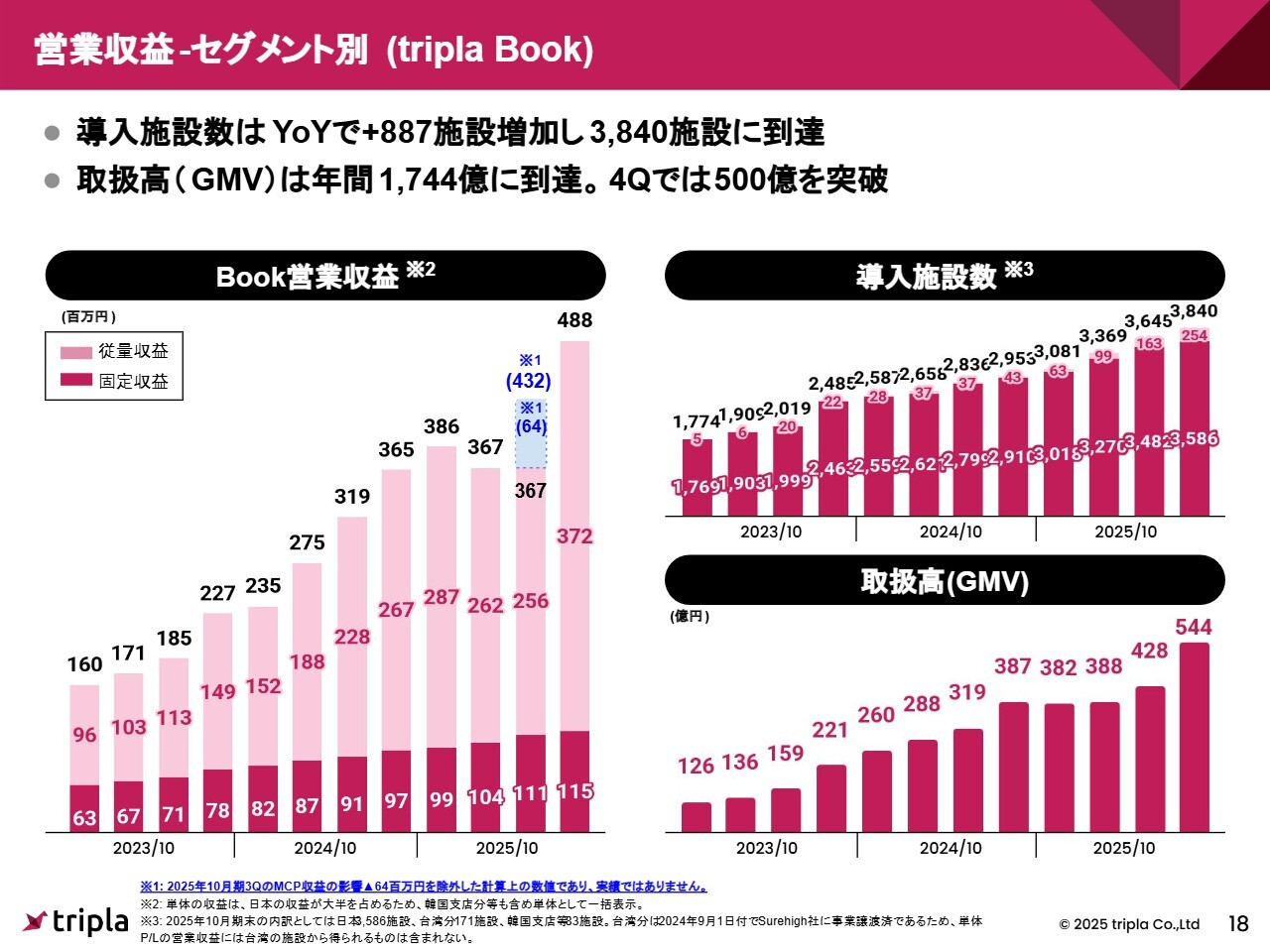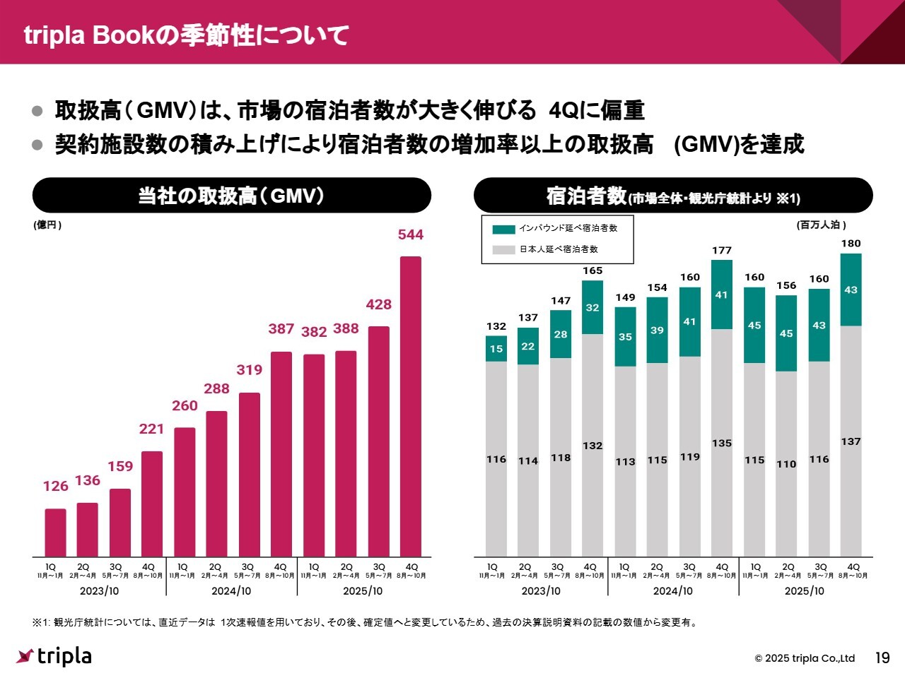 「tripla Book」の季節性については、引き続き非常に大きな影響を受けていますが、第4四半期は国内インバウンド宿泊が好調で、総計で1億8,000万人が宿泊しました。当社は544億円のGMVを達成することができました。