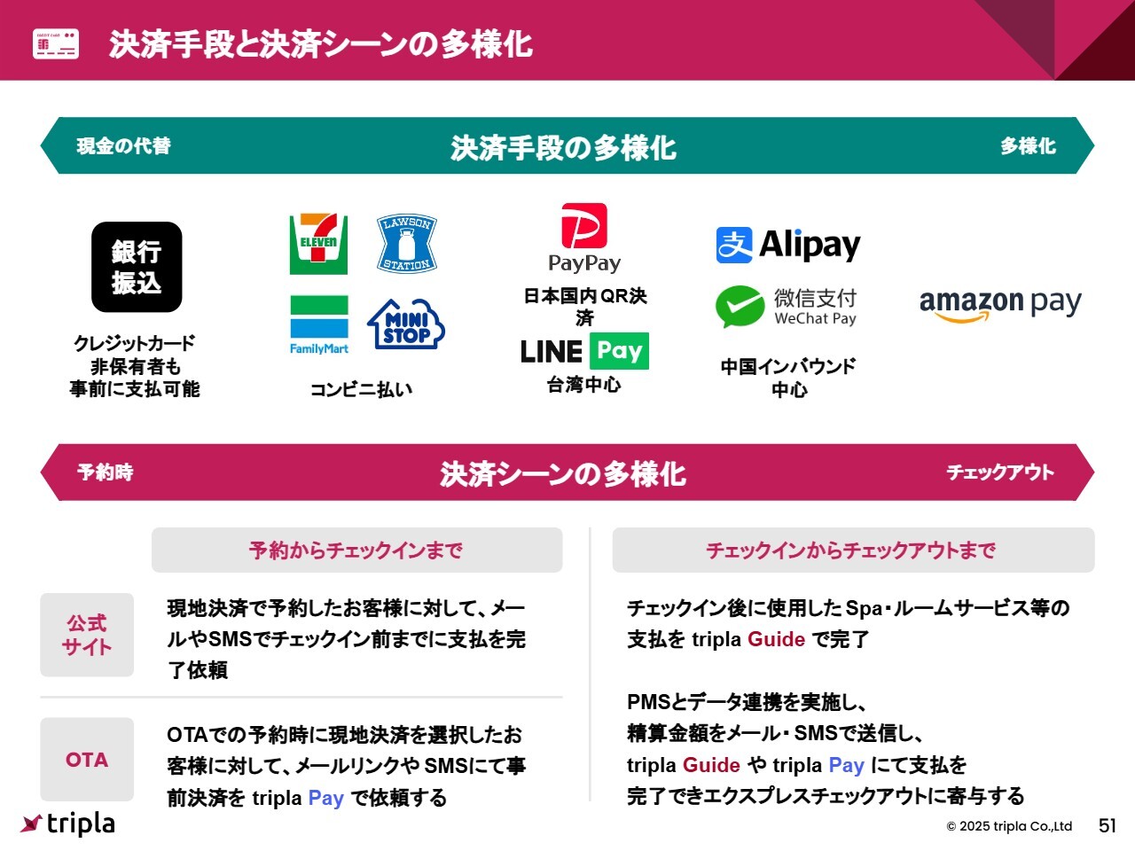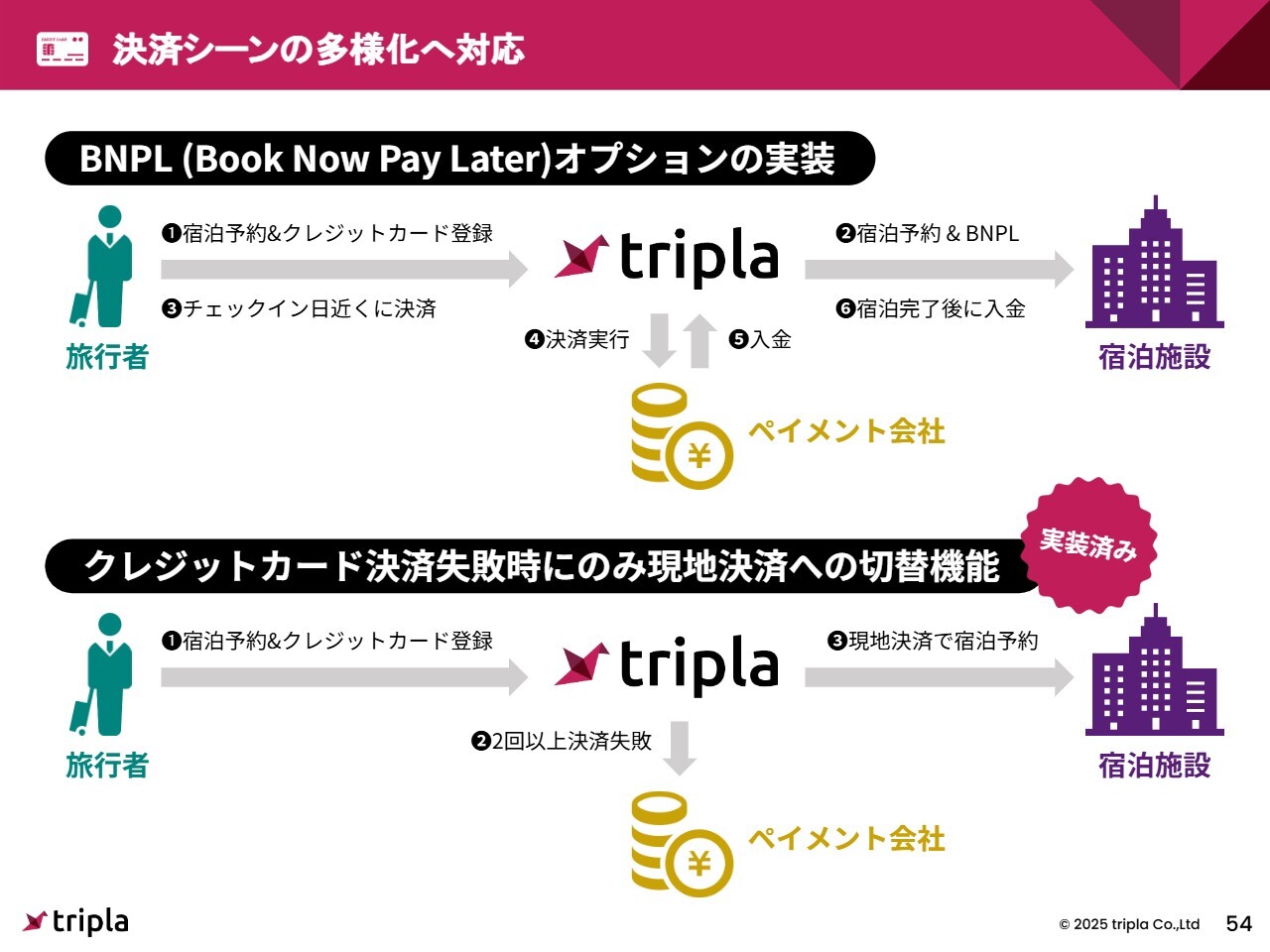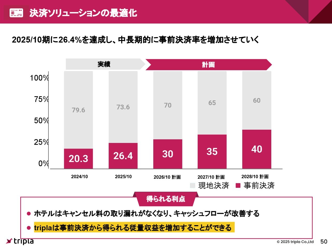 例えば、「tripla Book」のBNPL(Book Now Pay Later)の実装や、コンビニ払い、銀行振込払いが可能になるといった決済手段や機能拡張を進めることに加え、それらを施設さまに実際に利用していただくことも含めて計画を進め、この30パーセントを達成していきたいと考えています。