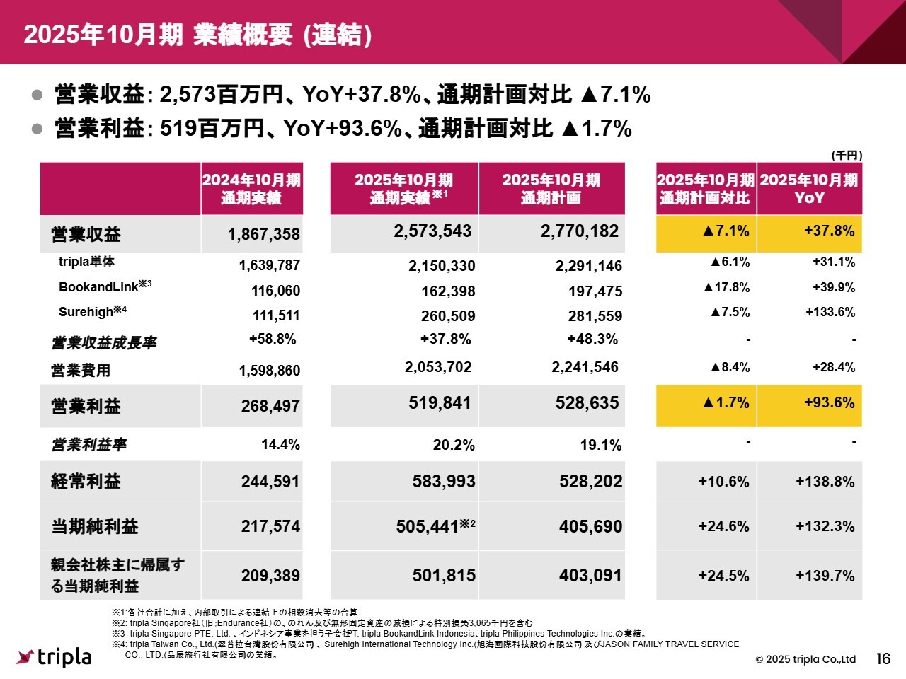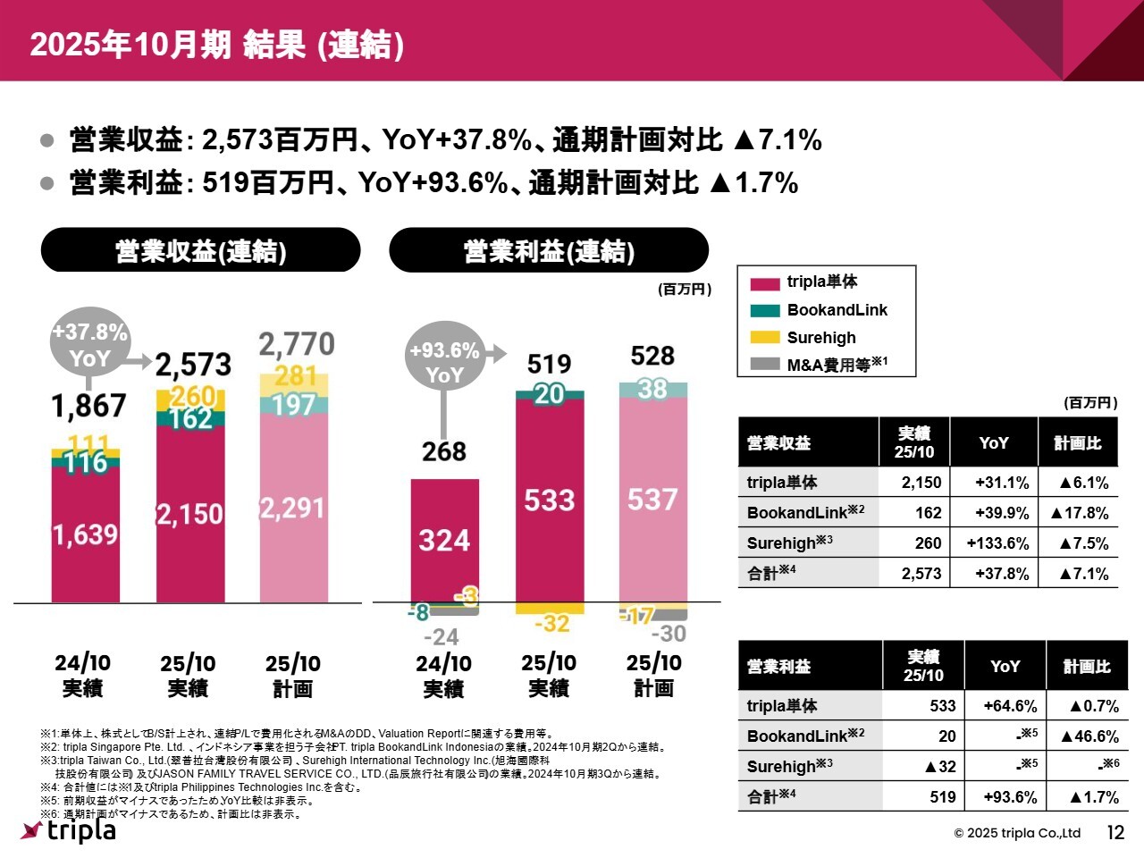 tripla---2025年10月期の個別業績と前期実績との差異 12/19 12:54