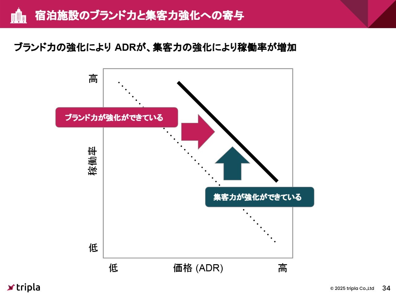 一方で、集客力が強化された状態とは、同じ価格であればより多くのお客さまに宿泊していただくことができ、結果として稼働率を向上させられる状態を指します。triplaとしては、この2つの点において貢献していきたいと考えています。