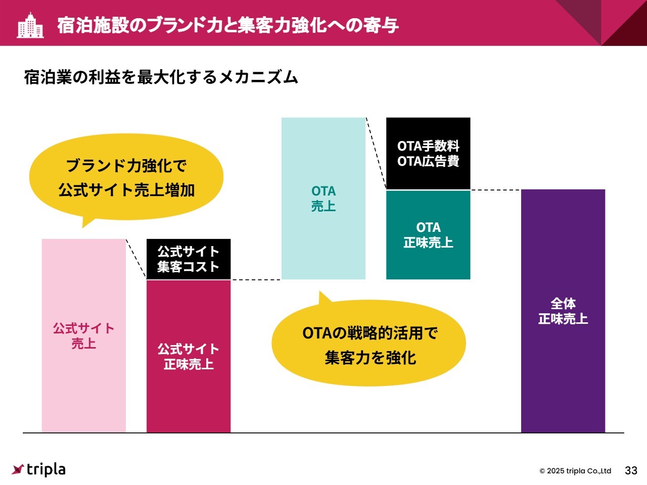 宿泊施設のブランド力および集客力強化への寄与についてです。これまでは、公式サイトでの売上を最大化することに重点を置き、ホテルや旅館との対話を進めてきました。しかし、今期からは、我々全体の「正味売上」を向上させることを目指しています。