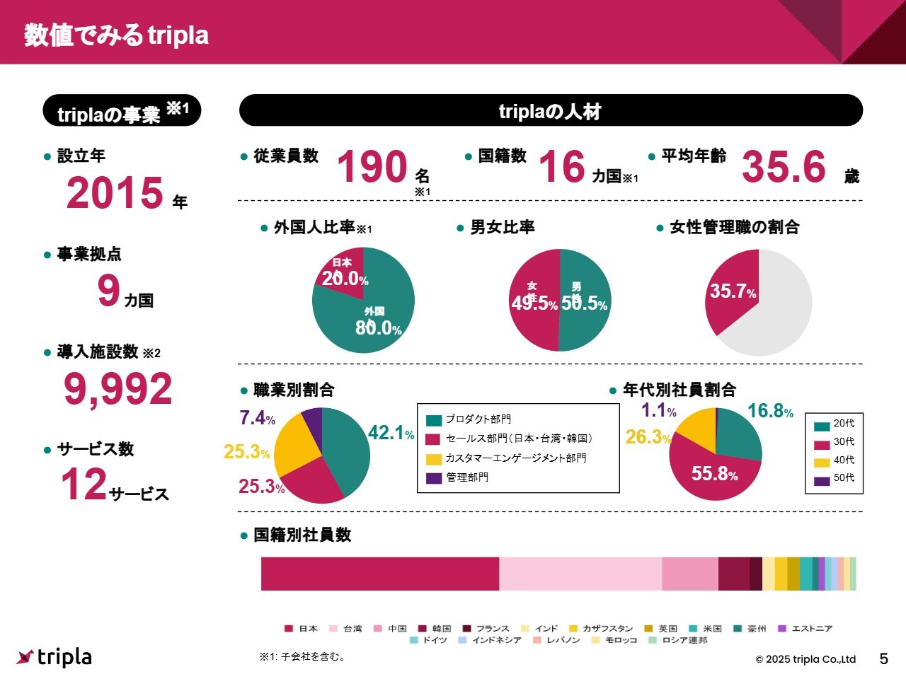 数値で見るtriplaについてですが、現在の導入施設数は9,992施設となっており、あと8施設で1万施設を超える見込みです。従業員数は190名、国籍数は16カ国、平均年齢は35.6歳です。