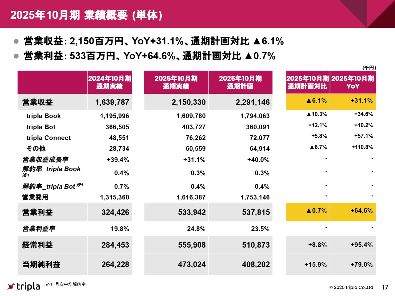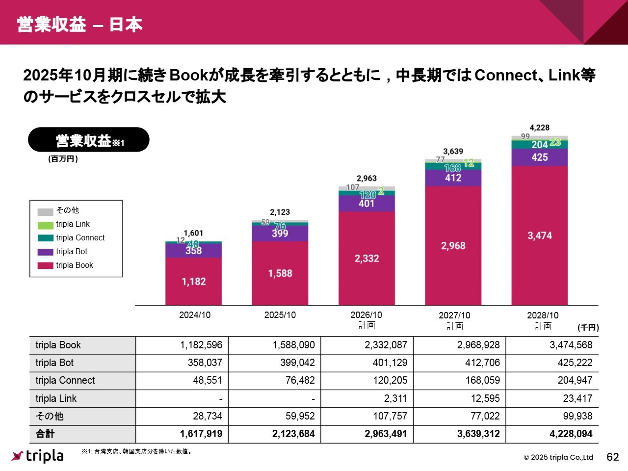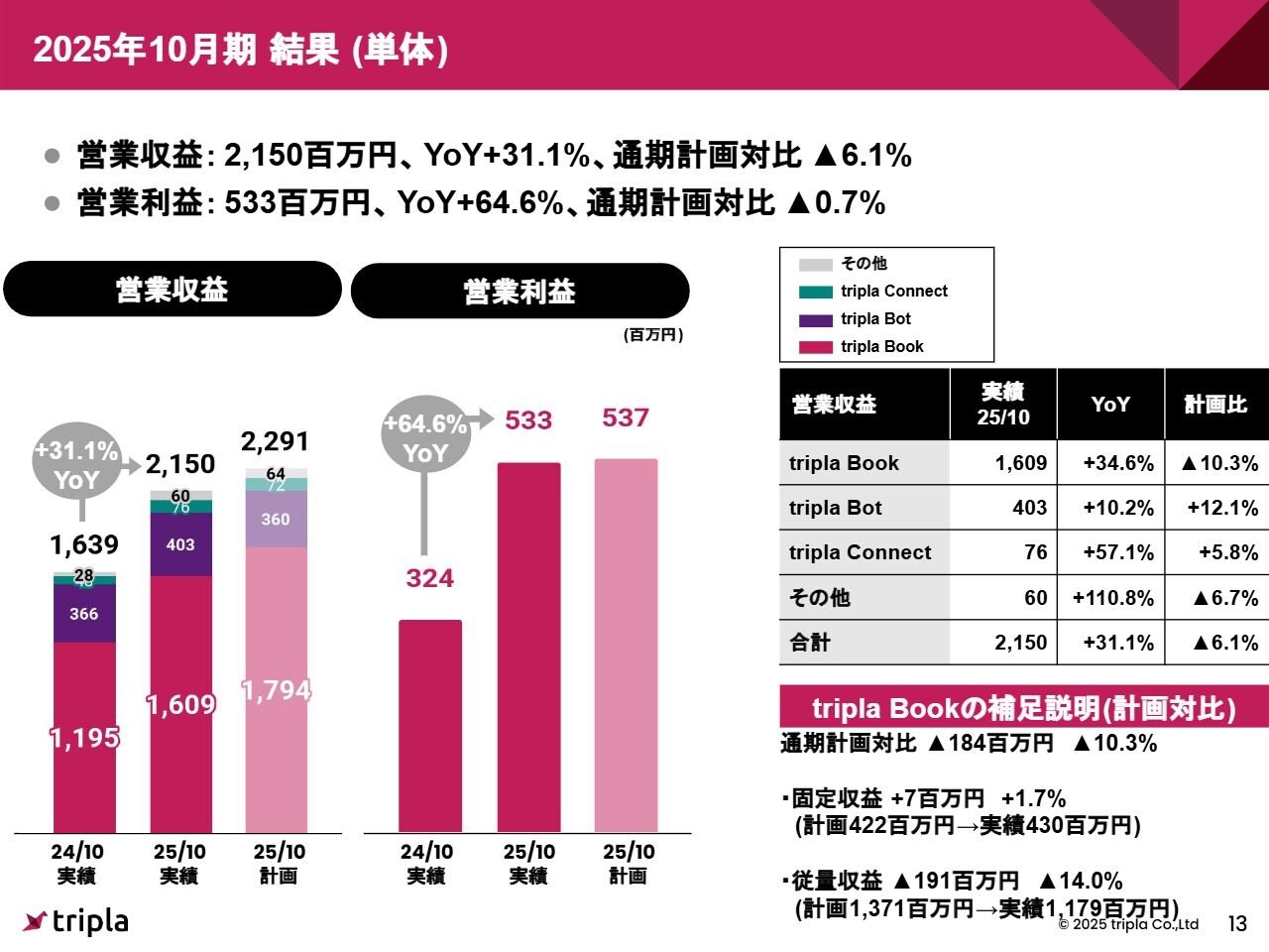 特に「tripla Book」が成長を牽引しており、前年同期比プラス34.6パーセントの成長を遂げました。2025年10月期には売上高が16億円に達成しています。