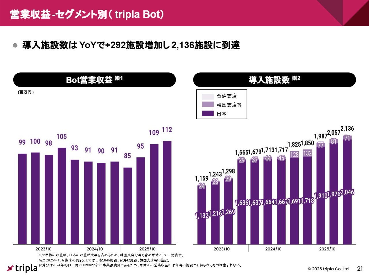 「tripla Bot」についてです。先期の第1四半期が底となり、8,500万円からV字回復を果たしました。その理由として、導入施設数が伸びていることが挙げられます。第4四半期の営業収益は1億1,200万円で、導入施設数は国内で2,046施設、グローバルで2,136施設となりました。