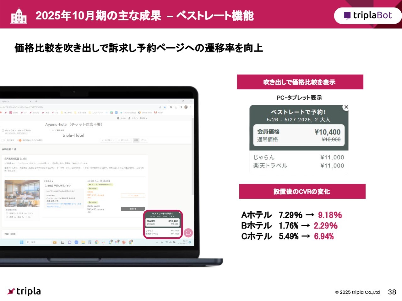 そして、お客さまがベストレートで予約できる点を訴求するサービスを提供しています。こちらのサービスは非常に好評で、「tripla Bot」の契約を希望するホテルも多くなっています。