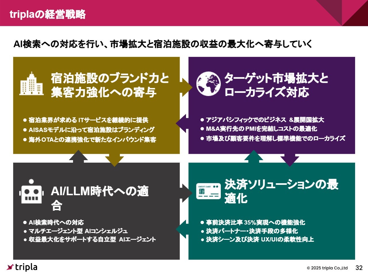 まず、1つ目は宿泊施設のブランド力と集客力強化への寄与、2つ目はターゲット市場拡大とローカライズ対応、3つ目はAI/LLM時代への適合、4つ目は決済ソリューションの最適化という4つを軸に経営戦略を策定しています。